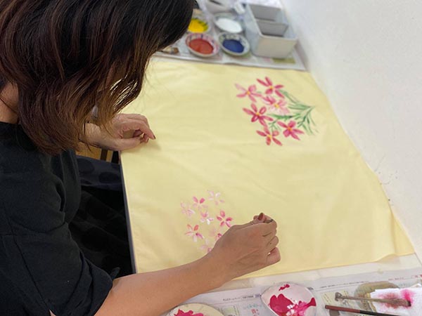 実演で、その場で描いているところを見て頂いたり、相談しながら自分だけの友禅を依頼していただくことも可能です。