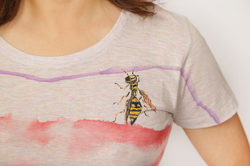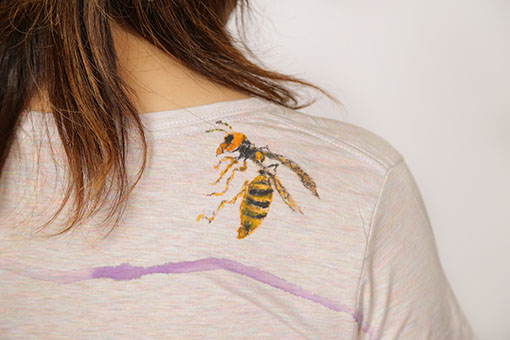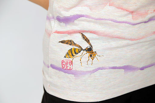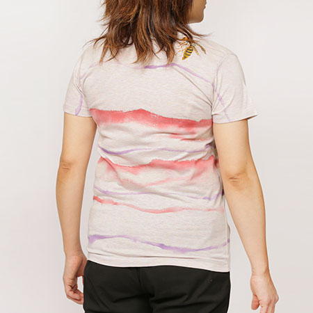 8月の暑い日に甘い樹液を吸う蜂。 大きな刷毛に染料液を含ませ、大胆に描いたボーダーの色は柔らかな紫と赤で着色し、木の樹液を表現しました。 独特のぼかし染めのボーダーが仕上がっております。 樹液などを吸っている蜂はおとなしく人間を攻撃するようなことは無いのです。 一点一点手描きのユニークな面白さと質感を楽しんで下さい。