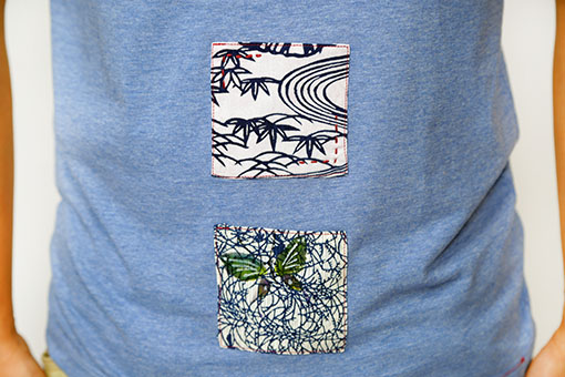 京都の鷹峯にある光悦寺の石畳を、着物生地でTシャツの中心に配置して表現しました。生地の中には、カラフルな釦や刺し子糸が入ったり、蝶々がいたり、てんとう虫がいたりと楽しい商品に仕上がっています。 このTシャツを着て風情ある光悦寺の石畳の参道を歩いてみては。