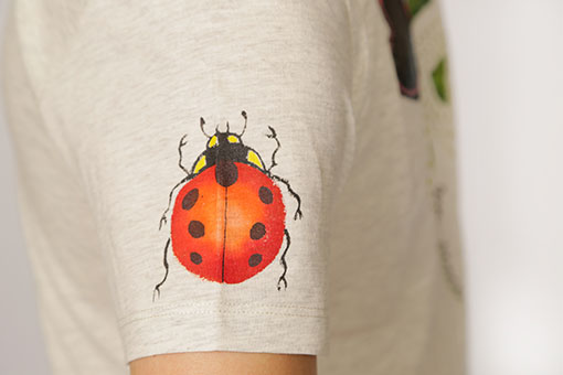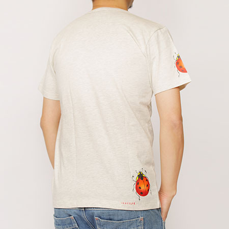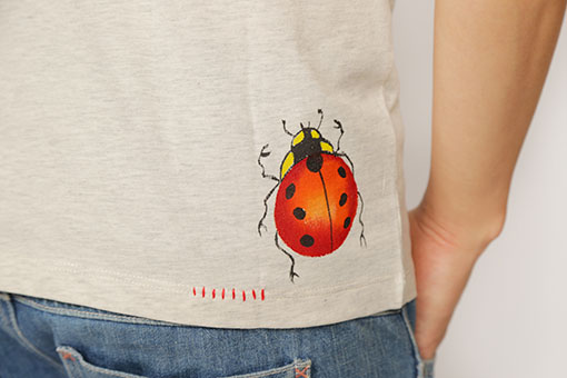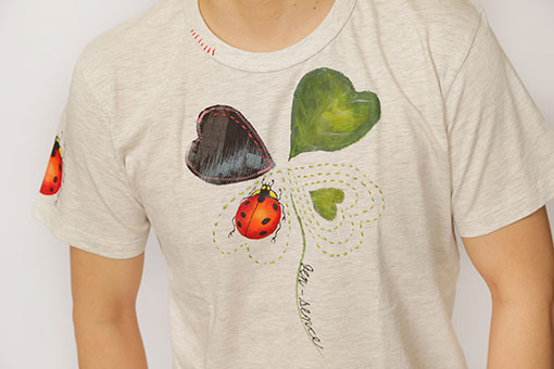 幸運が訪れる四つ葉のクローバーにてんとう虫。着ると強運になれるかもしれない一品です。手描きをしたり、生地を張り付けたり、刺し子したりと、心のこもった一品。肩にも後ろにもてんとう虫が止まっています。
