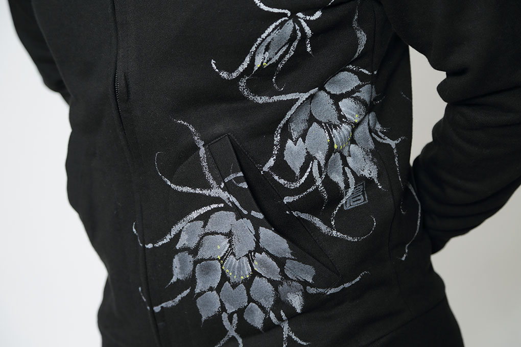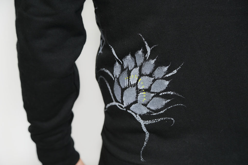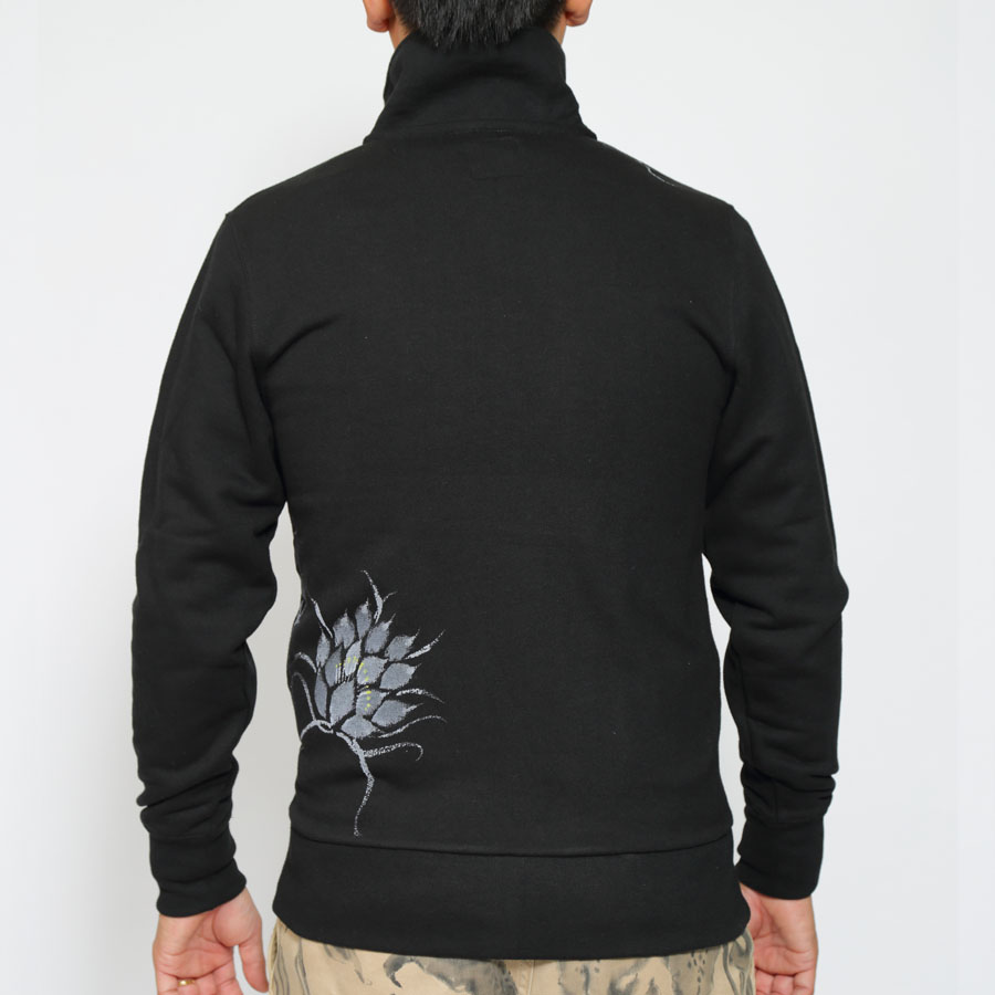 月下美人の花を抽象的に描きました。 衿を立てても、寝かせて着てもさまになる一品です。 パンツにもスカートにも合わせやすいアイテムです。