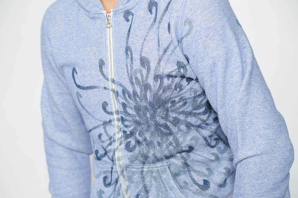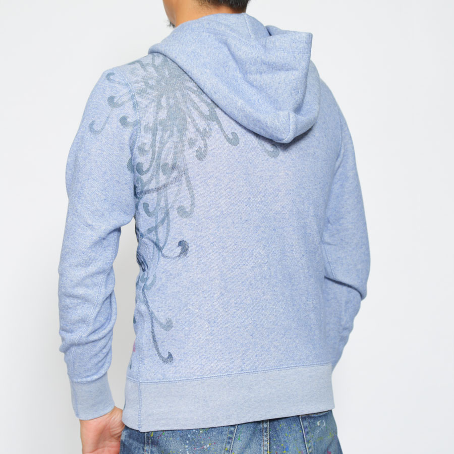 大輪の乱菊を4色の濃淡を作り表現しました。大胆な大柄を纏い心も大きく開き、楽しく街を歩いて頂きたい一品です。素材は柔らかく、着心地は最高のパーカーです。