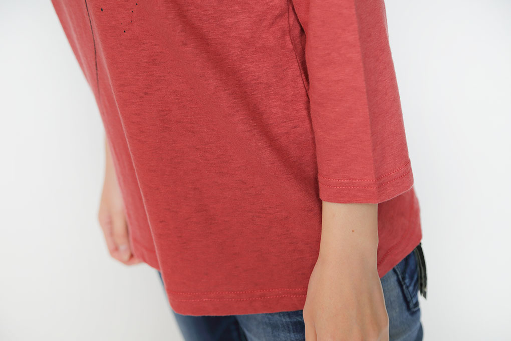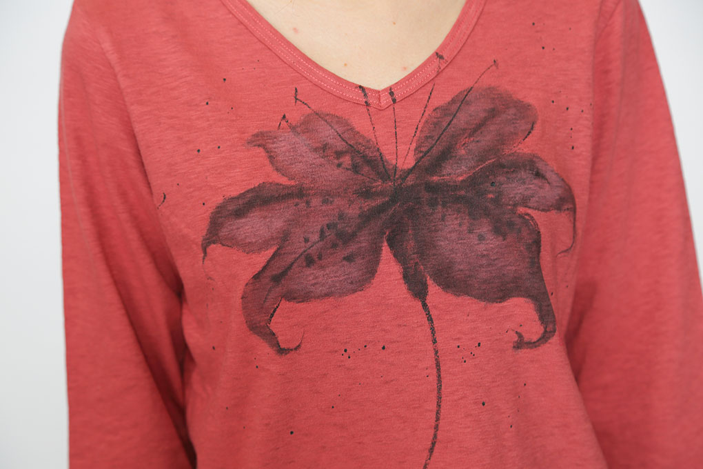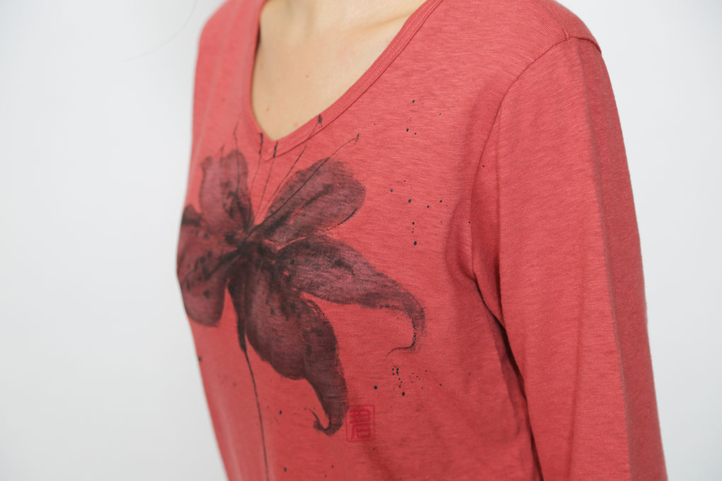 白い百合を墨色濃淡3色で表現しました。 リリーは聖母マリアの象徴、花言葉は【純粋】 Tシャツを着ると純粋な心になれる様に…と願いを込めて胸に柄を入れました。 素材は不揃いな糸質により、表面に細かい凹凸が出るので、それによりラフ感のある自然な仕上がりの質感になります。肌触りも良く、最高の着心地になります。
