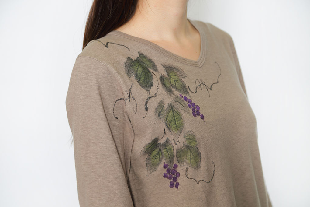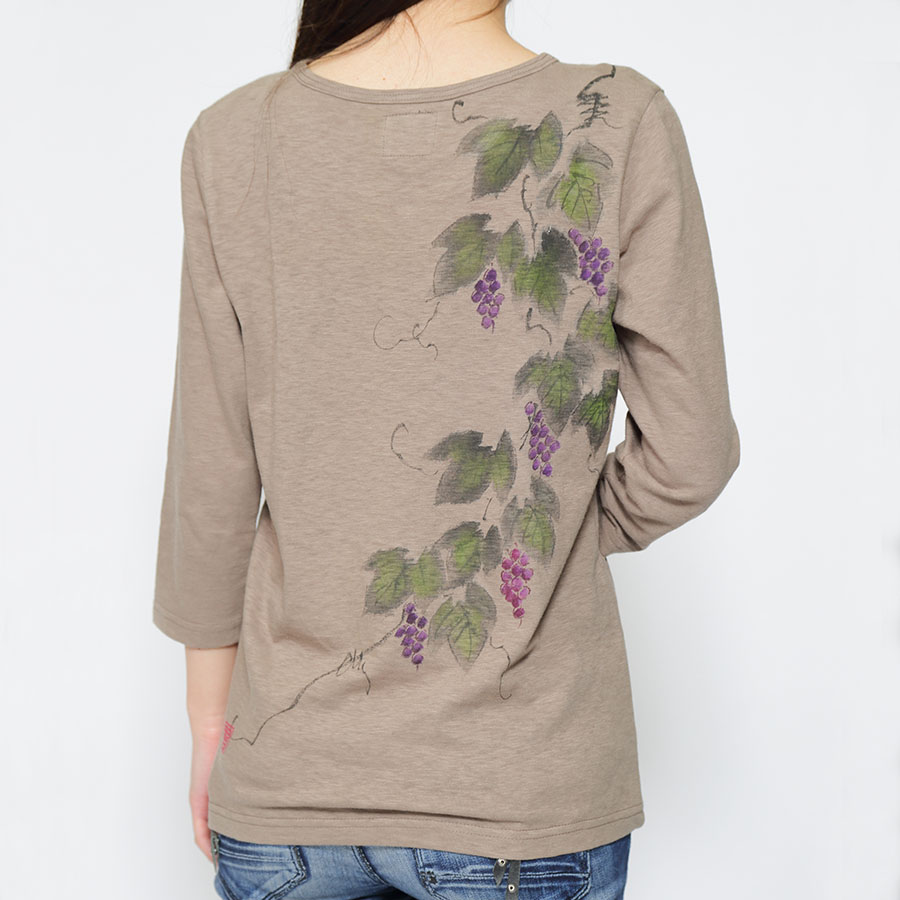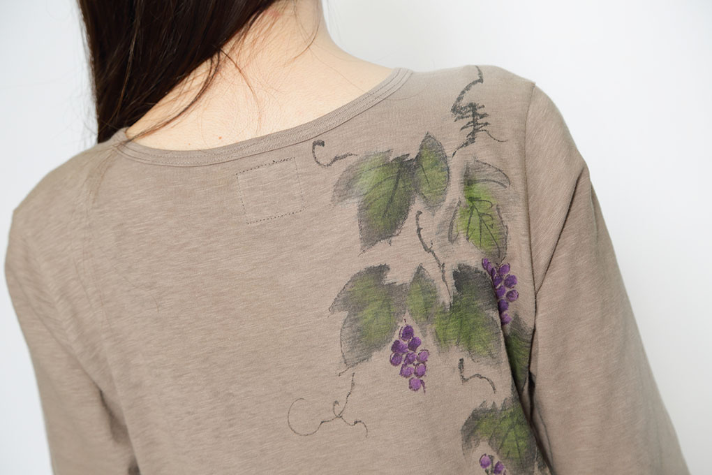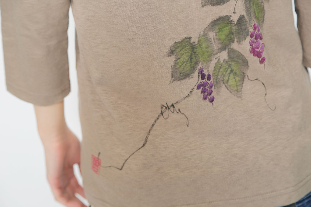 前には少しの葡萄ですが、後ろには豪華に流れるような葡萄がたくさん成っています。 他の物に巻き付き沢山の実を付けるところから、他の者を取り込み一緒に実を結ぶ(成功)を意味する。縁起物の葡萄VネックTシャツです。 素材は不揃いな糸質により、表面に細かい凹凸が出るので、それによりラフ感のある自然な仕上がりの質感になります。肌触りも良く、最高の着心地になります。