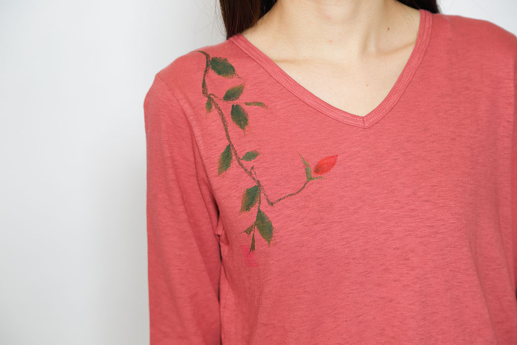 茶室の中でわびさびの効いた掛花入の京椿は利休も愛でた事でしょう。 素材は不揃いな糸質により、表面に細かい凹凸が出るので、それによりラフ感のある自然な仕上がりの質感になります。肌触りも良く、最高の着心地になります。