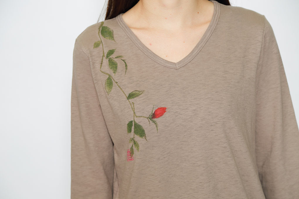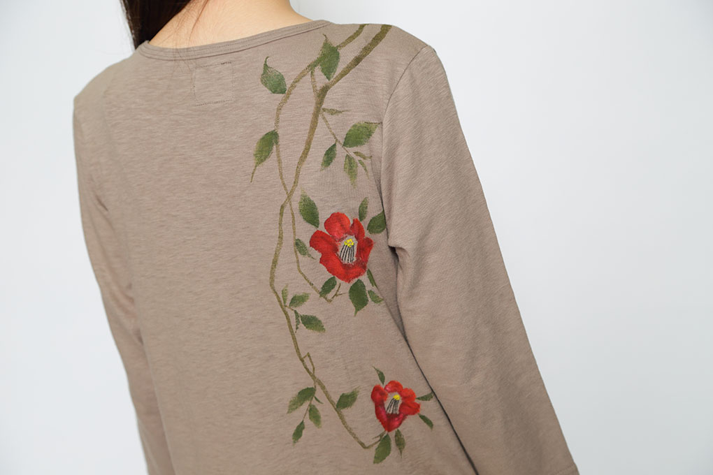 茶室の中でわびさびの効いた掛花入の京椿は利休も愛でた事でしょう。 素材は不揃いな糸質により、表面に細かい凹凸が出るので、それによりラフ感のある自然な仕上がりの質感になります。肌触りも良く、最高の着心地になります。