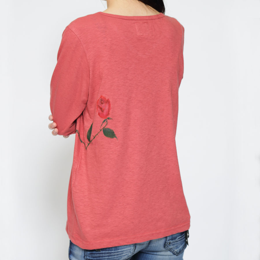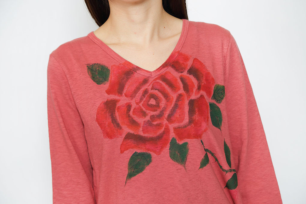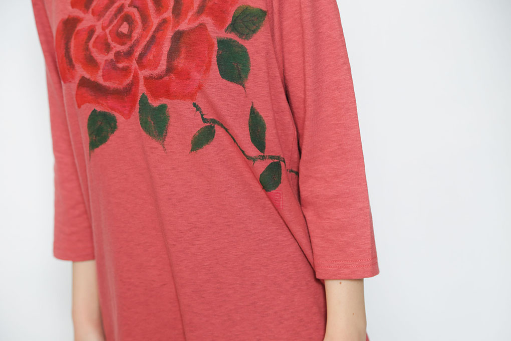 「花の女王」薔薇は誰もが知っている花の1つです。古くから愛や美を象徴として愛されて来ました。薔薇は色により花言葉が一つ一つ違います。赤薔薇はあなたを愛します。1枚で着てもインパクトのある柄位置ですが、インナーとしてジャケットの下から見える薔薇もとても粋で素敵な着こなしです。素材は不揃いな糸質により、表面に細かい凹凸が出るので、それによりラフ感のある自然な仕上がりの質感になります。肌触りも良く、最高の着心地になります。