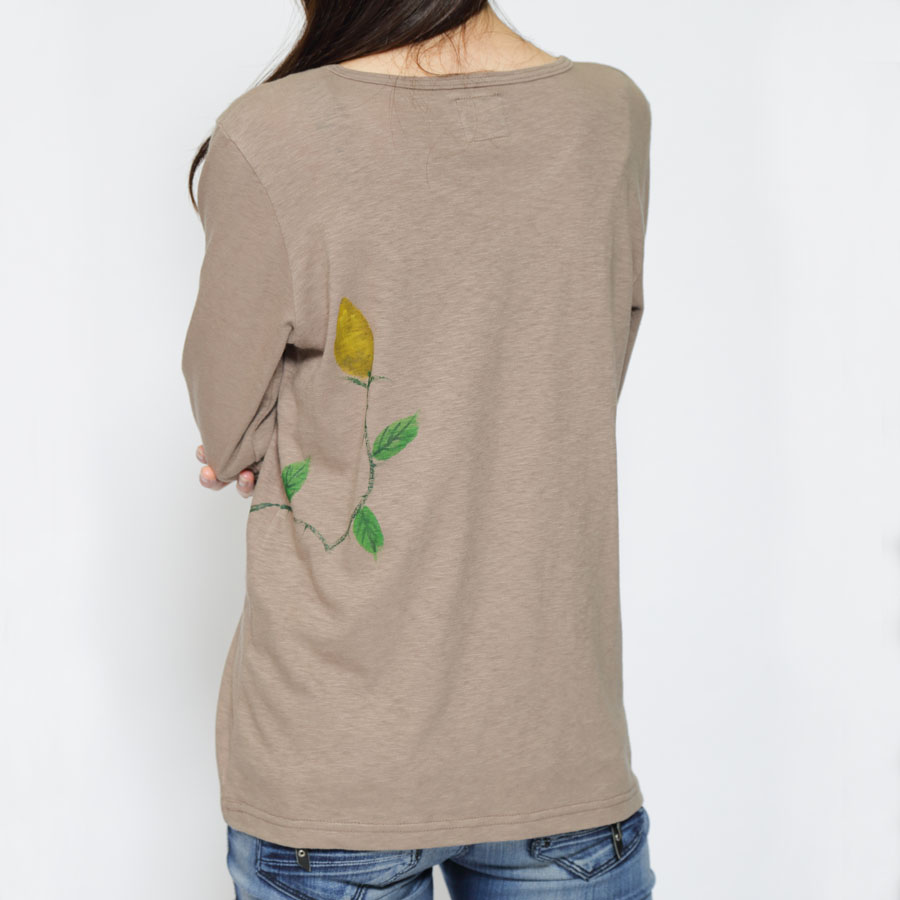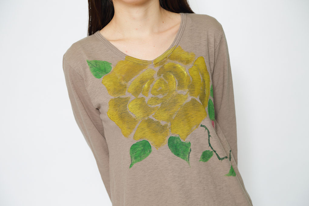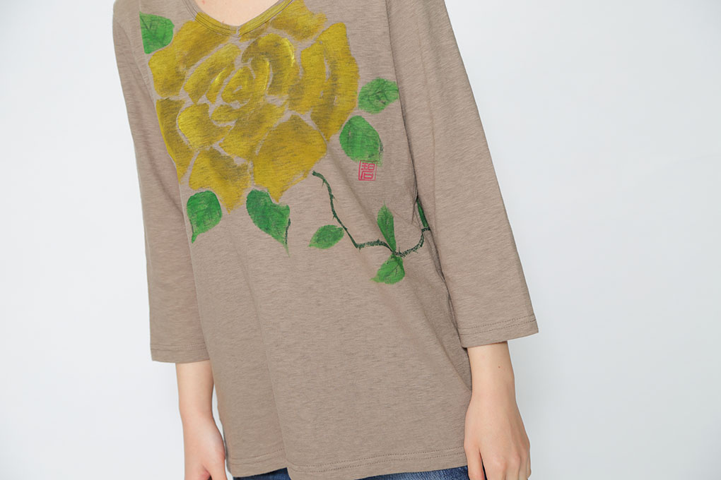 「花の女王」薔薇は誰もが知っている花の1つです。古くから愛や美を象徴として愛されて来ました。薔薇は色により花言葉が一つ一つ違います。黄ばらは愛の告白1枚で着てもインパクトのある柄位置ですが、インナーとしてジャケットの下から見える薔薇もとても粋で素敵な着こなしです。素材は不揃いな糸質により、表面に細かい凹凸が出るので、それによりラフ感のある自然な仕上がりの質感になります。肌触り良く、最高の着心地になります。