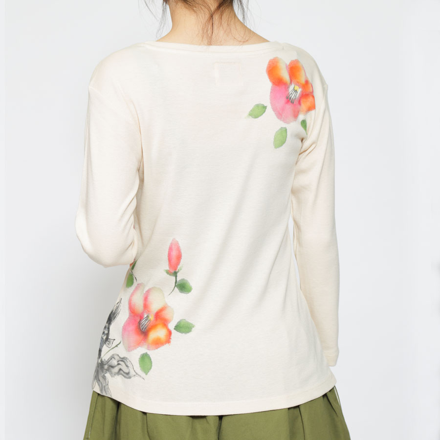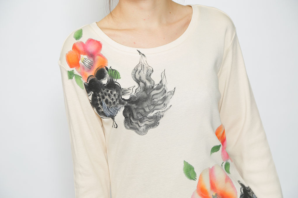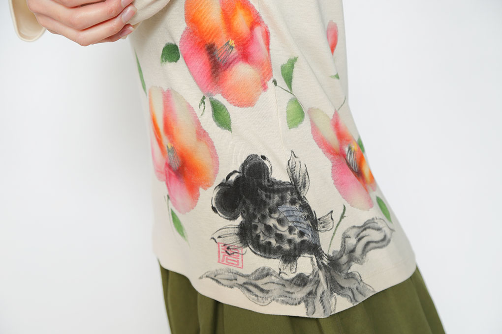 濡れ椿の間を泳ぐ、2月の黒出目金は大人しく妖艶な動きをして春の訪れを待ちます。 七分Tシャツの素材はフライスなので身体には少しフィットします。スカートやワイドパンツに合わせて頂きたい一品です。