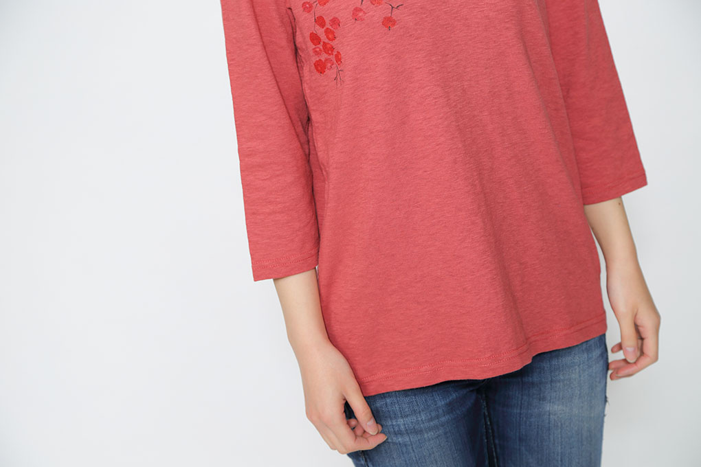 穏やかさ、静けさ、女性らしさをあらわす丸い赤は南天の実です。古くから南天は難を転じると言い伝えのある吉祥の庭木です。南天VネックTシャツを着ているとあなたの身を待ってくれるかも。 素材は不揃いな糸質により、表面に細かい凹凸が出るので、それによりラフ感のある自然な仕上がりの質感になります。肌触りも良く、最高の着心地になります。