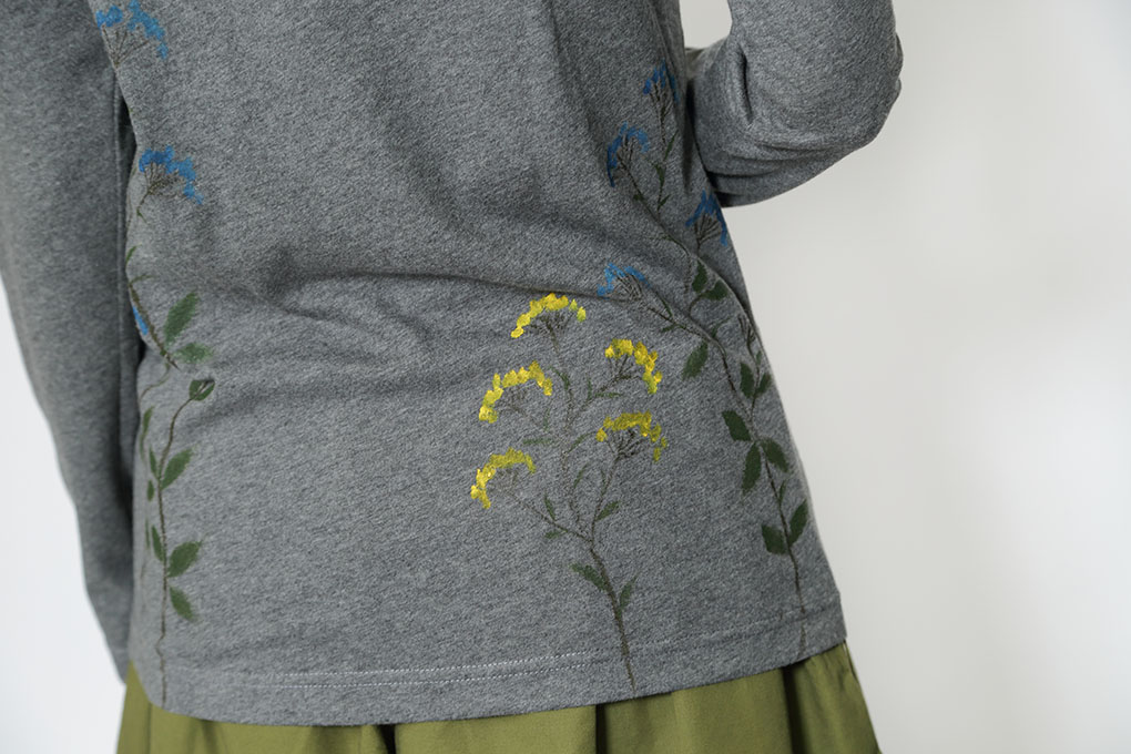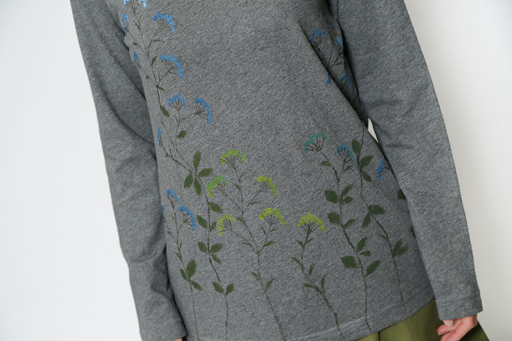 古くは万葉集や古今和歌集にも使われた女郎花は長きにわたり日本人に愛されて来ました。 肌触りが良く着心地の良いオーガニックコットンに秋風に揺れる女郎花を表現しました。 その姿は何処か繊細で寂しそうな女性をイメージしてしまう秋の花です。
