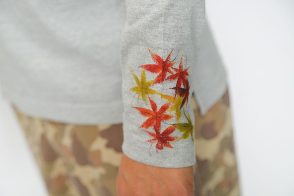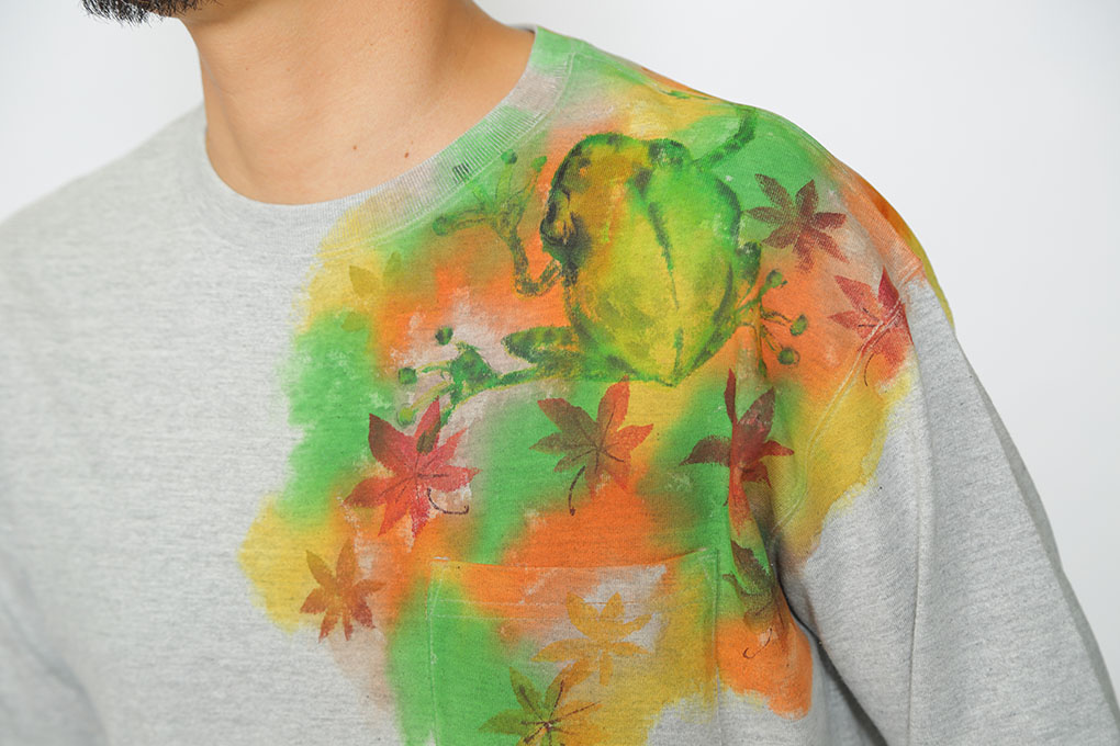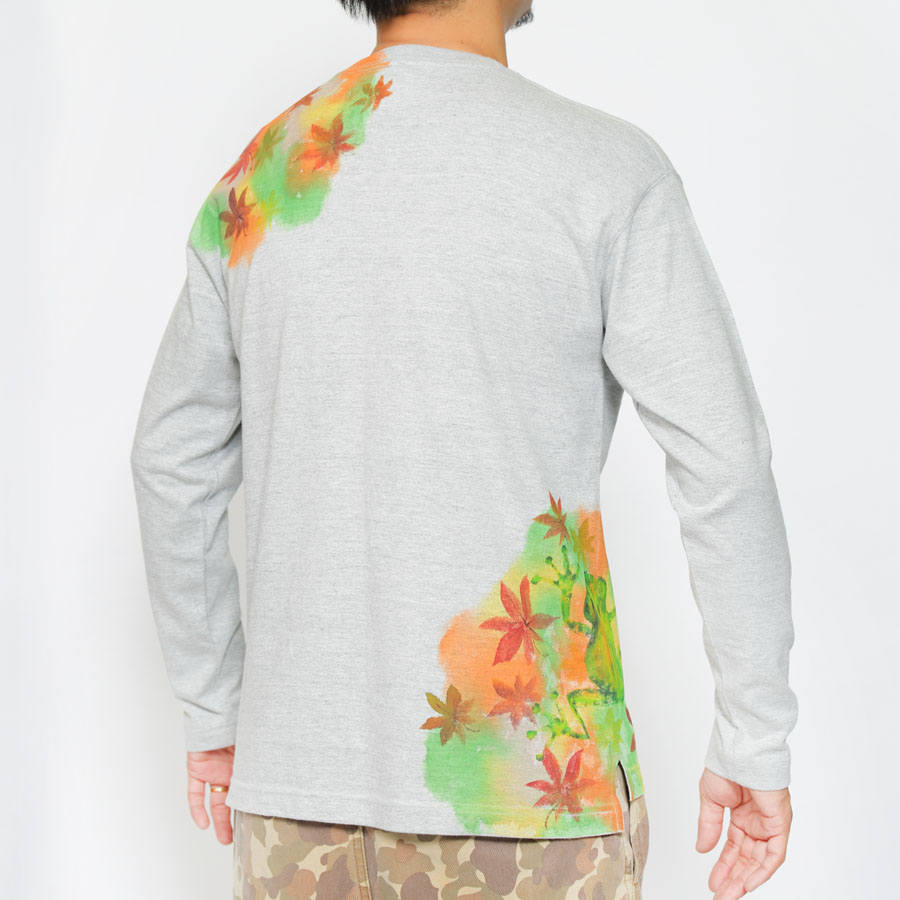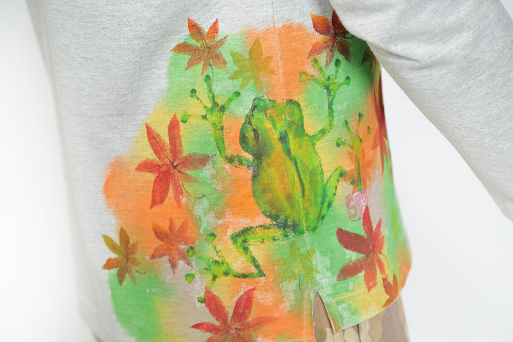 通天橋の下を見ると蛙と紅葉を発見。 重なり合うような奥行きを付ける為、大きな刷毛で秋色を薄目のトーンで色付けし、その後に紅葉と蛙を描きました。 シルエットは少しゆったりのポケット付きロングTシャツになります。
