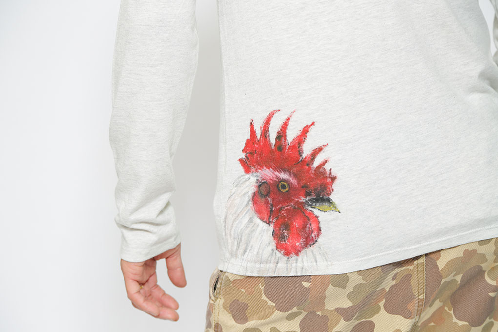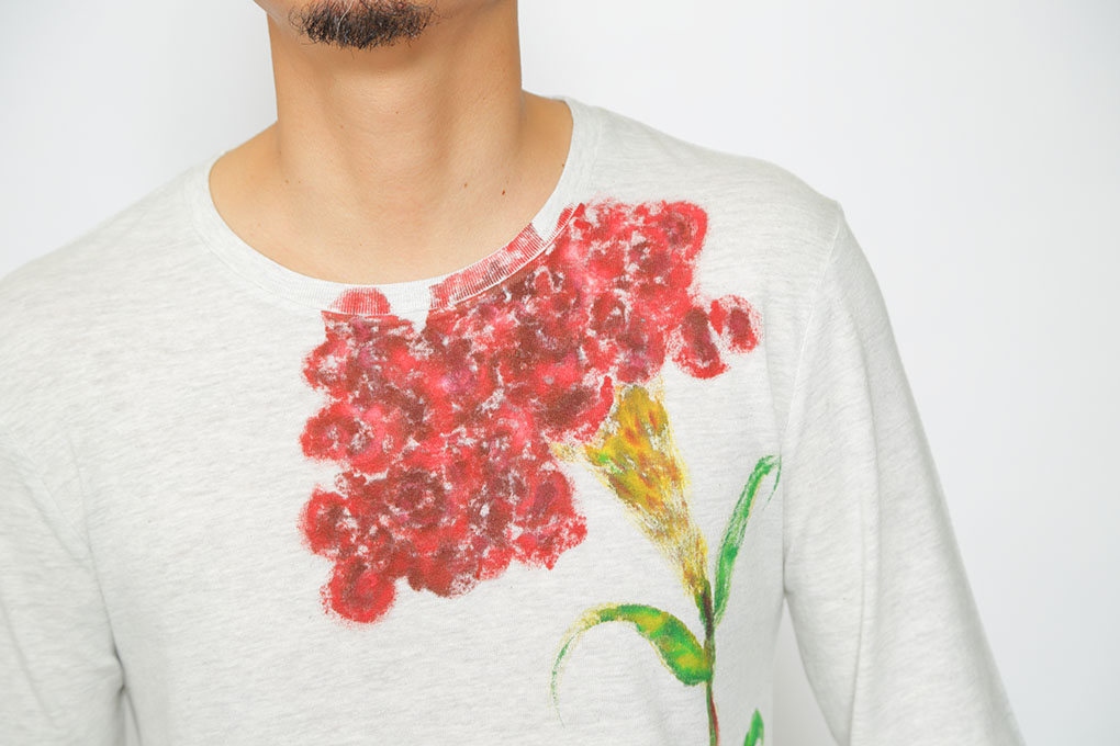 鶏頭の花を大きく大胆に描きました。花が鶏の鶏冠に似ているのでこの名前になりました。後ろの裾には鶏が顔を出しています。