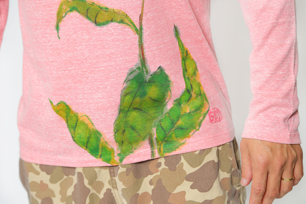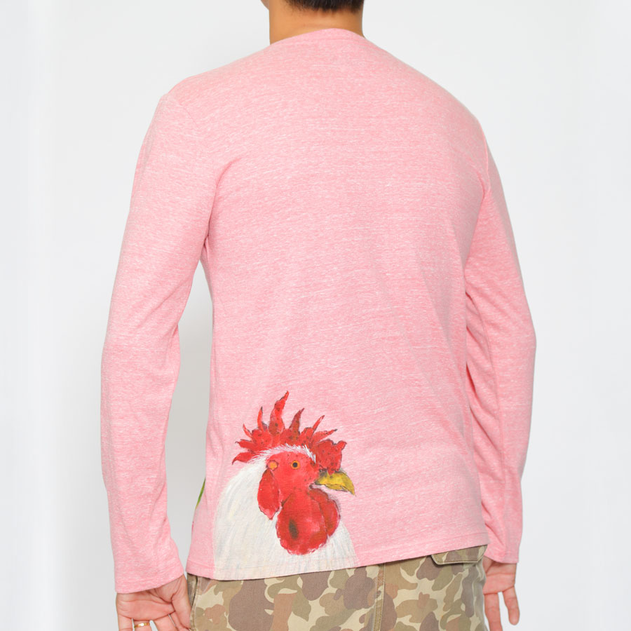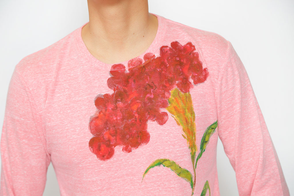 鶏頭の花を大きく大胆に描きました。花が鶏の鶏冠に似ているのでこの名前になりました。後ろの裾には鶏が顔を出しています。