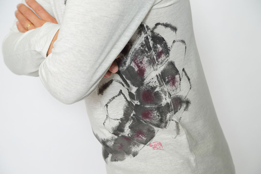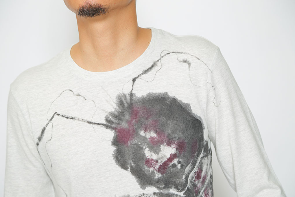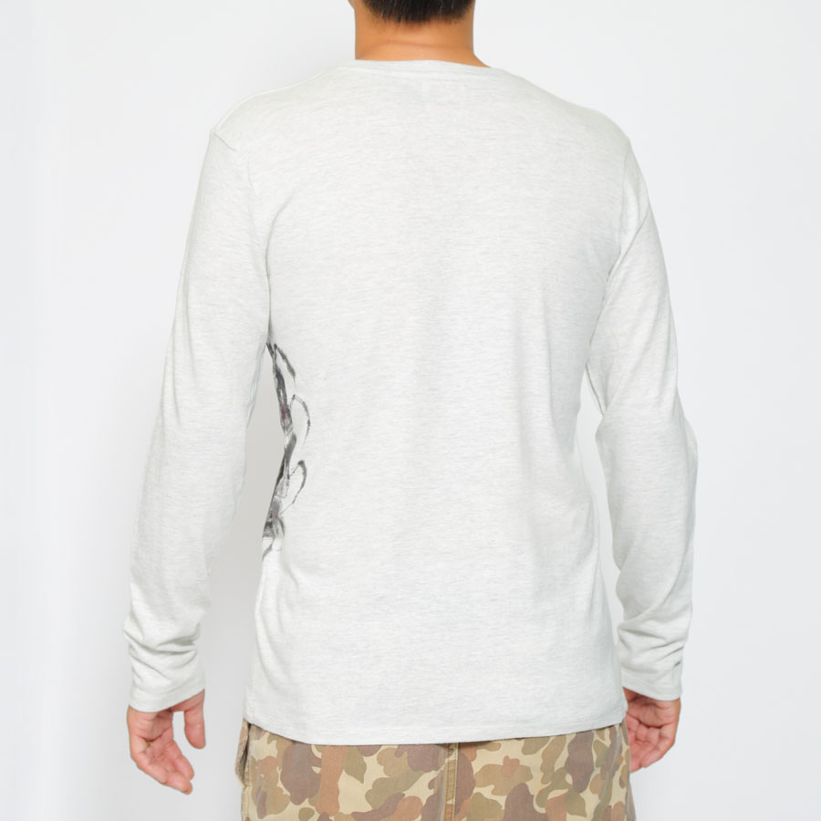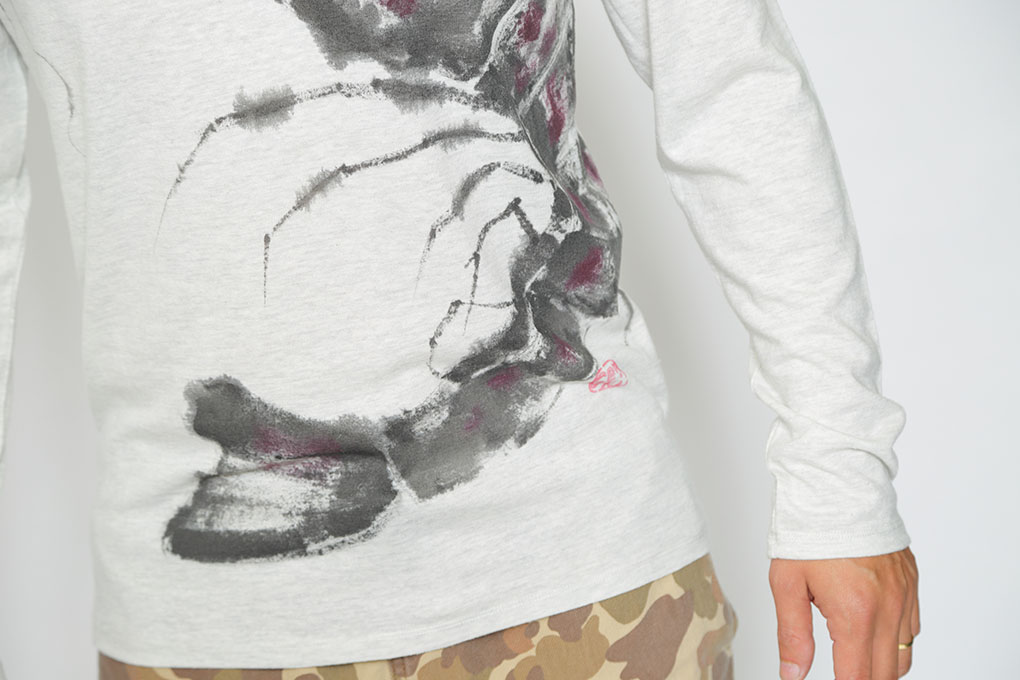 大きな海老がロングTシャツの半分の見頃に描かれました。大胆な柄の大きさに繊細な色遣いは粋な1枚です。