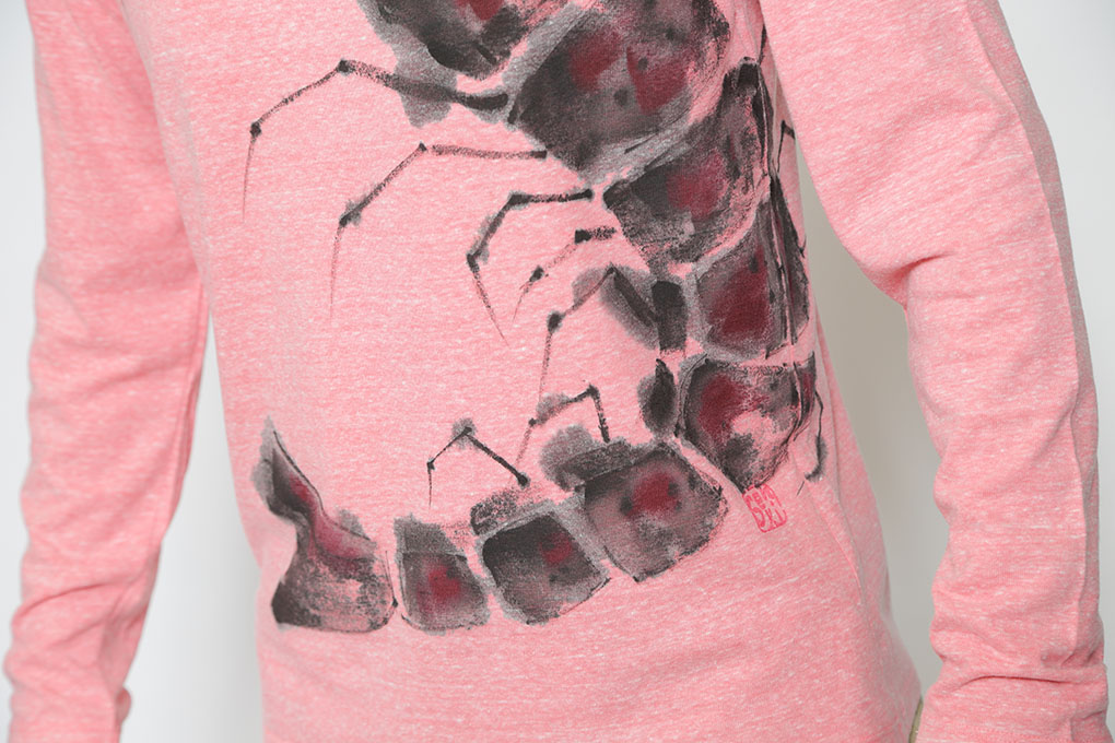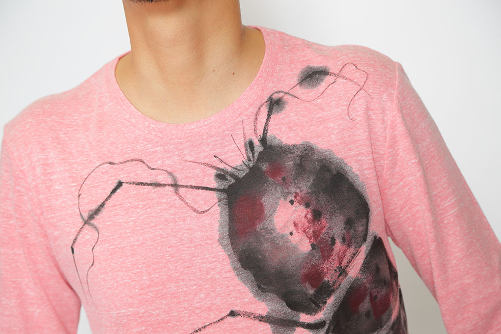 大きな海老がロングTシャツの半分の見頃に描かれました。大胆な柄の大きさに繊細な色遣いは粋な1枚です。