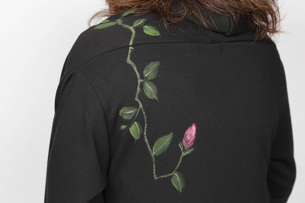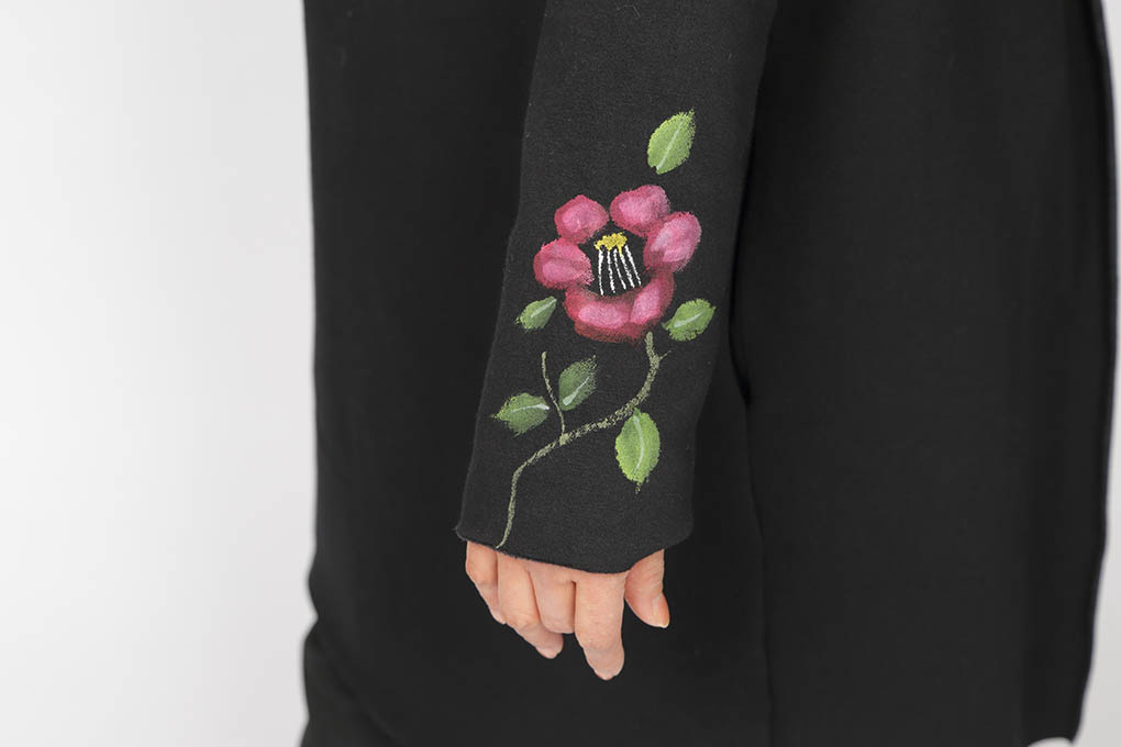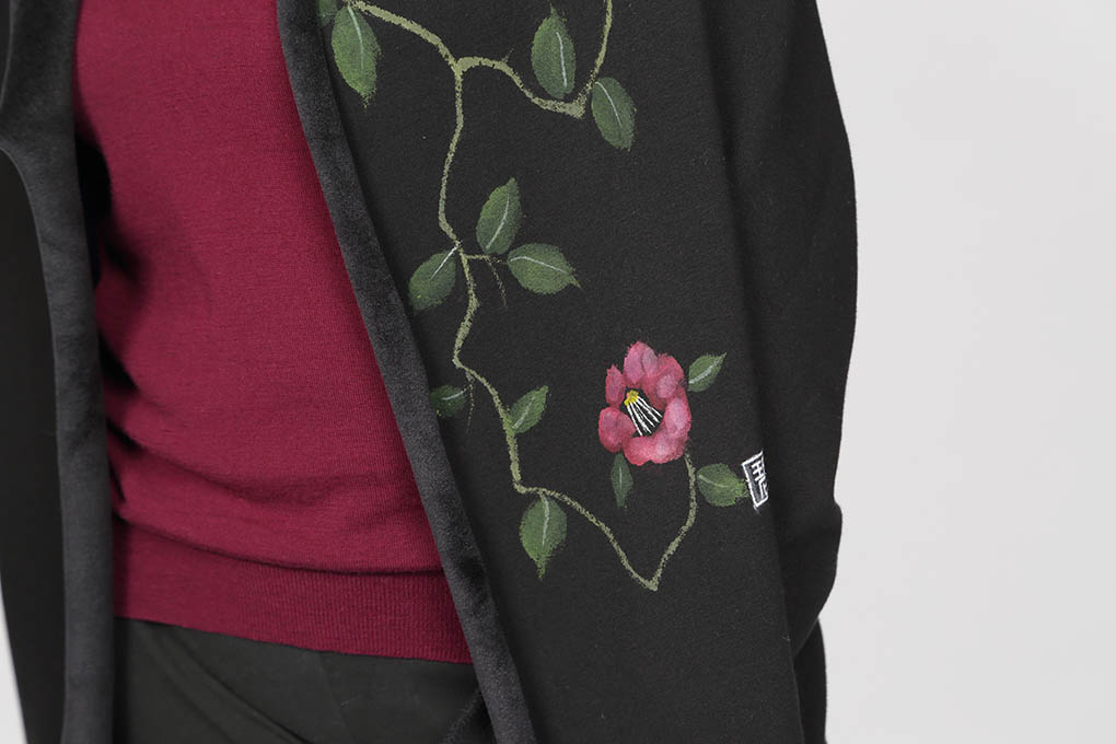 暖かくて柔らかいムートン素材の裏地と同系色の表地で仕上げた上品なコートです。 表と裏の粋な仕様を壊す事無く、さりげなく目隠れする様に絵付けされた椿は、侘び寂びを感じます。 この冬には大活躍する軽くて着心地の良いコートです。