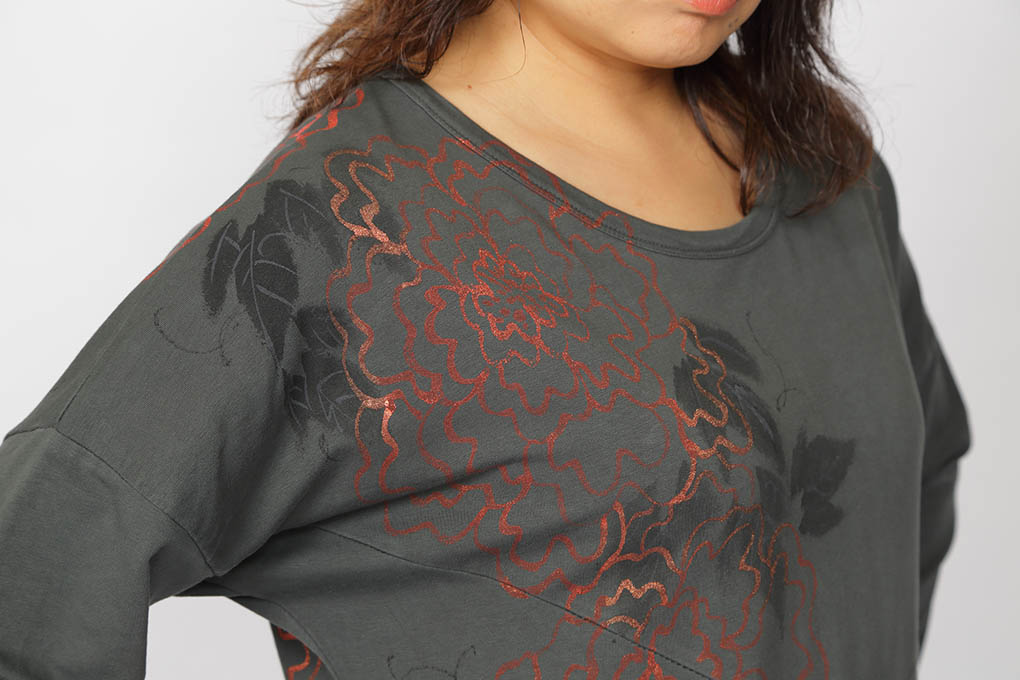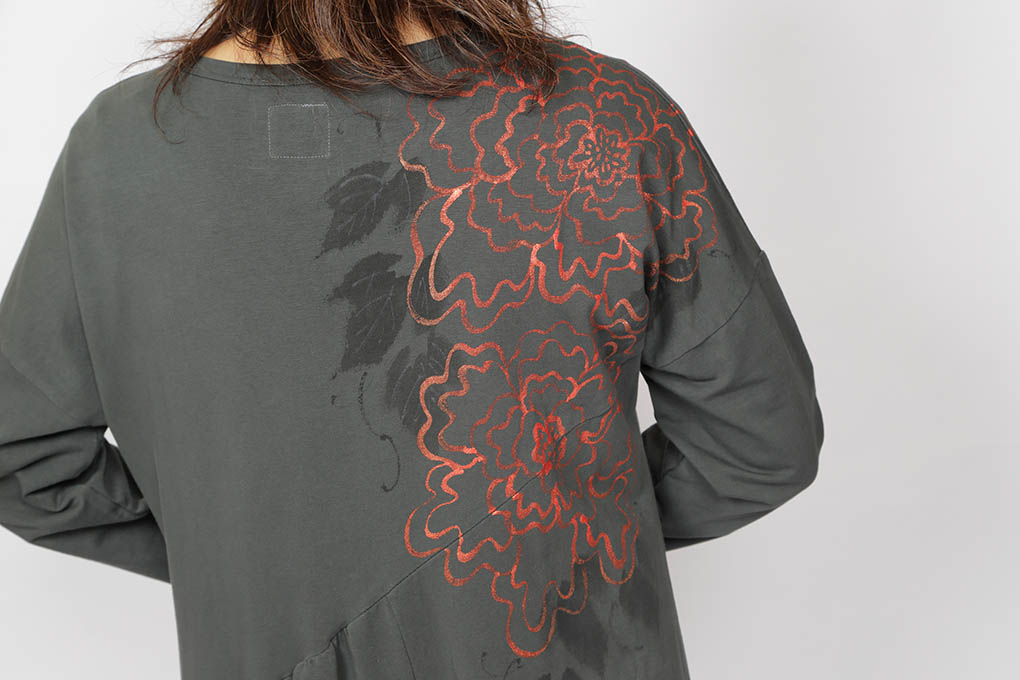 金色と赤色のインクを混ぜ、牡丹の花を繊細な線で描き、葉を大きな刷毛で大胆に描きました。 ロングワンピースの左側縦半分一面に細長く描かれた柄は、大胆なシルエットにも負ける事無く迫力ある物に仕上がりました。