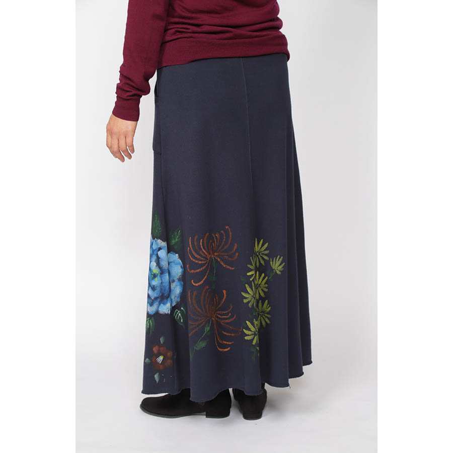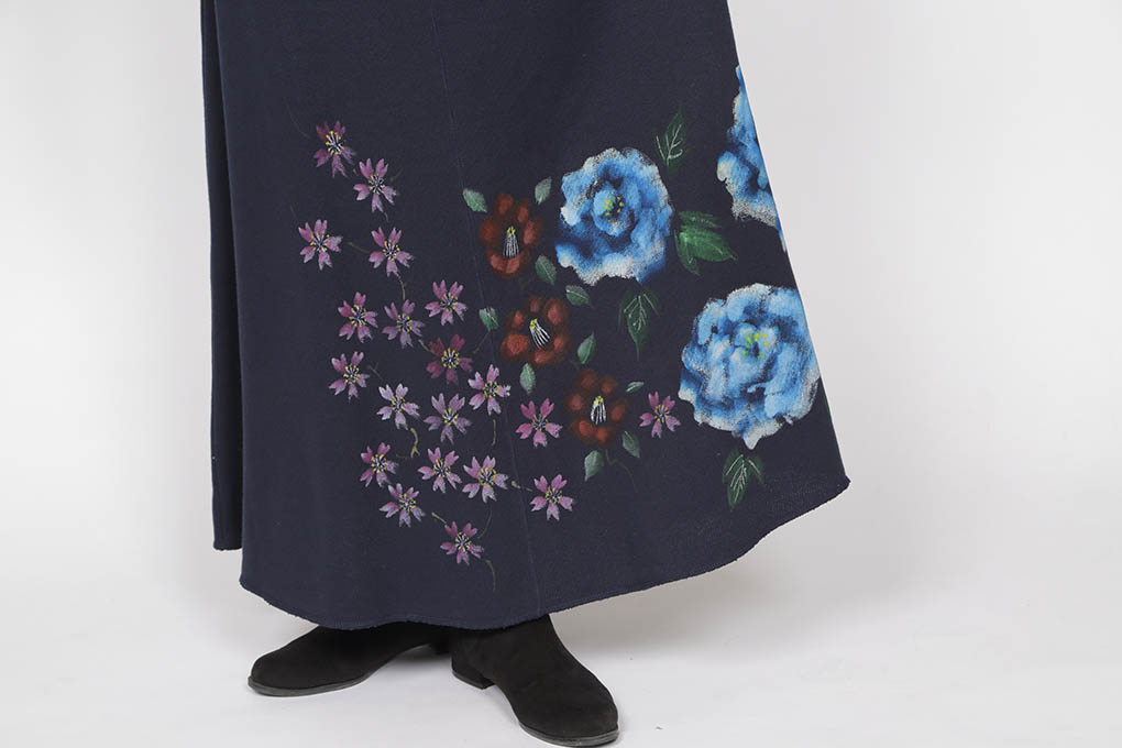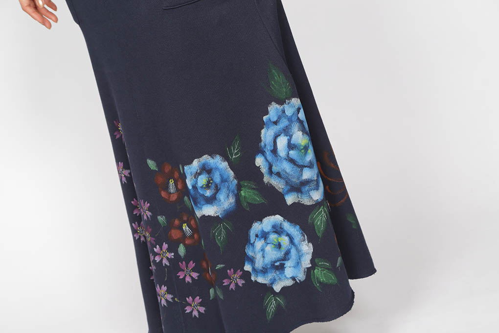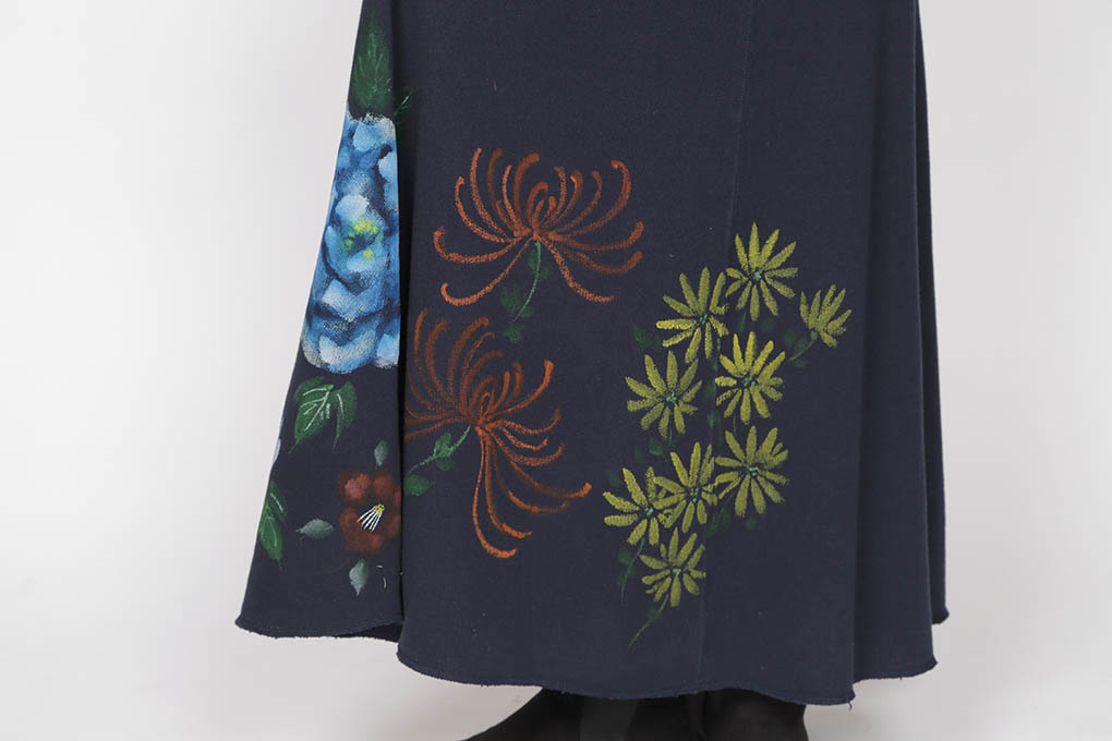 室町時代から日本人が愛した柄をヒントに、碧三先生が裏毛素材のスカートに四季折々の花々を描きました。