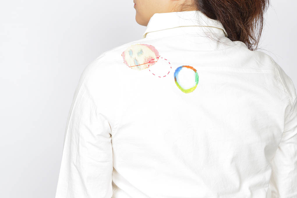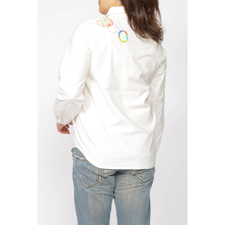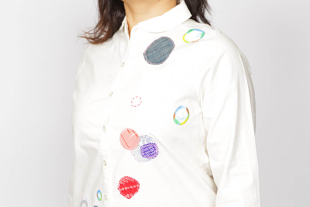 手描きしたうさぎ柄の布をリメイクしてシャツにパッチワークしました。 お手玉も手描きしたり、また古布でリメイクしたり、手刺し子をあしらったり、楽しくて可愛らしいシャツに仕上がりました。