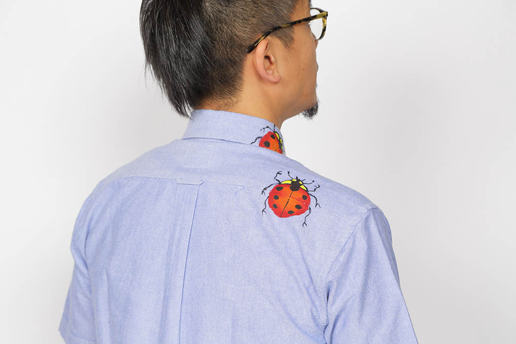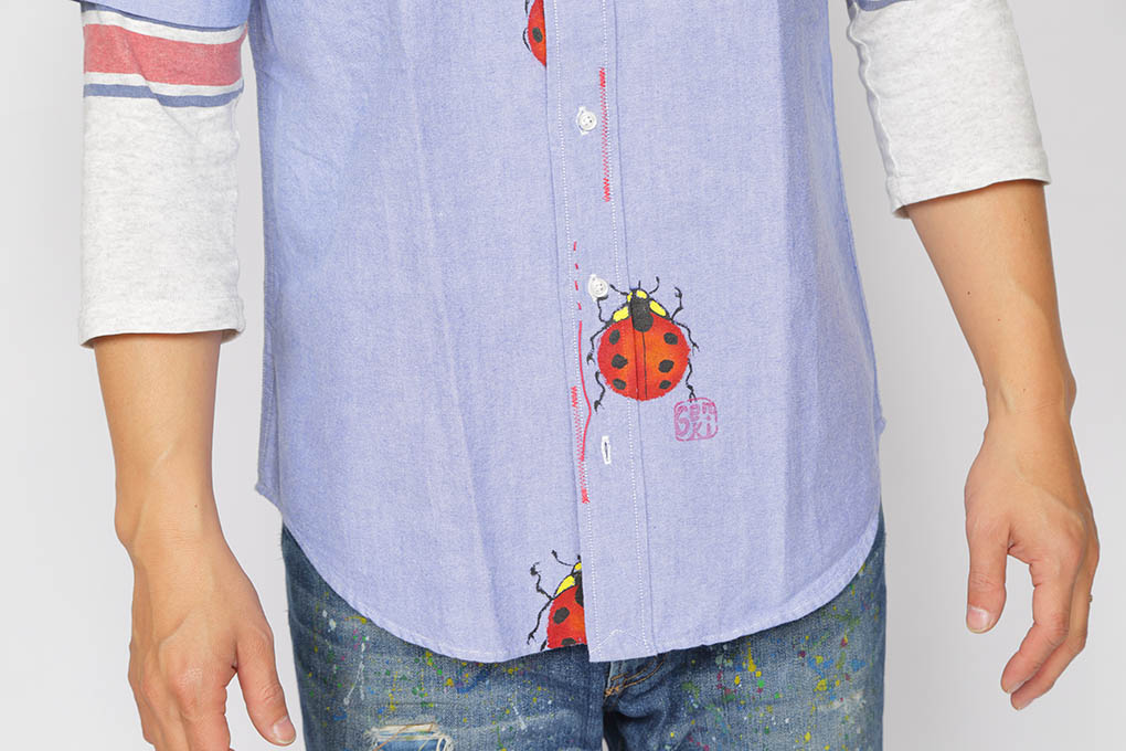 綿のオックスフォードシャツに手刺し子やステッチを施し、その合間を天道虫達が楽しく行進をしています。 手描きでしか入れられない柄位置の面白さを楽しんで下さい。