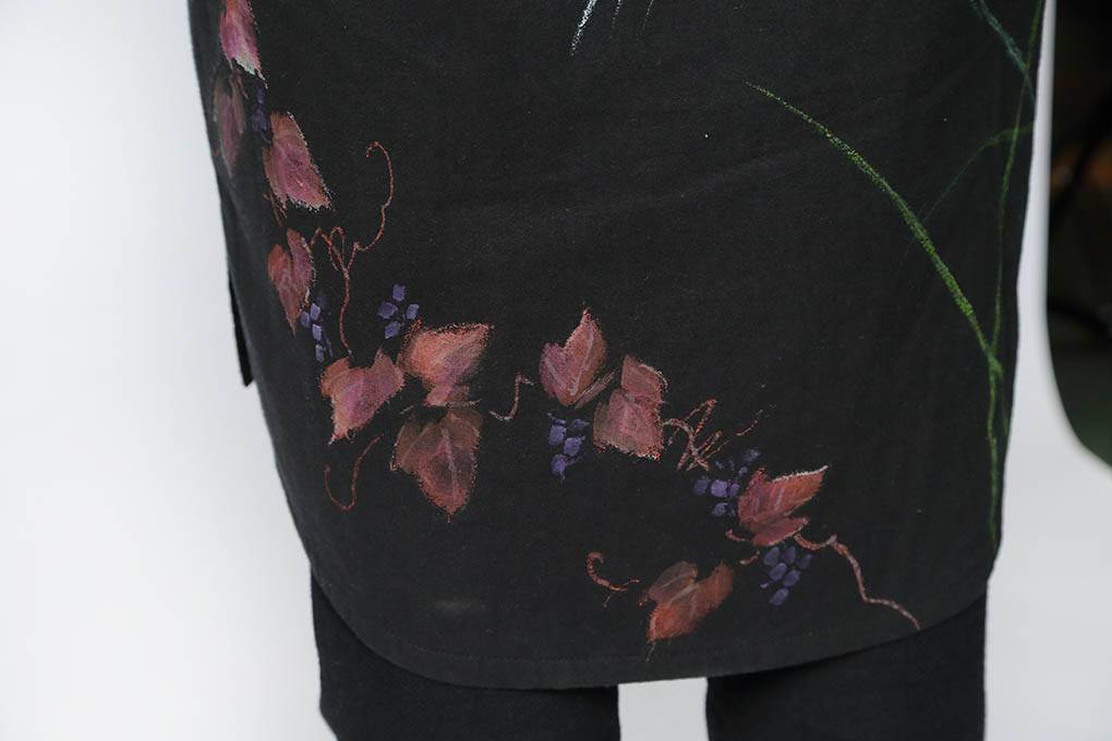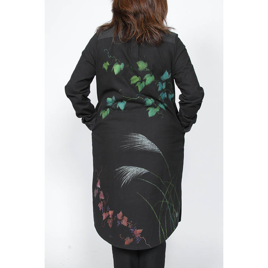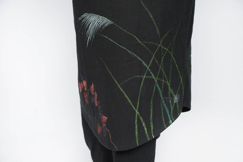 異素材を組み合わせてキルティングされているので、暖かくて心地良いです。 ロングシルエットのコートには、風にそよぐ秋草紋様を描きました。 細身のパンツに合わせてシャープに着て頂きたい一品です。