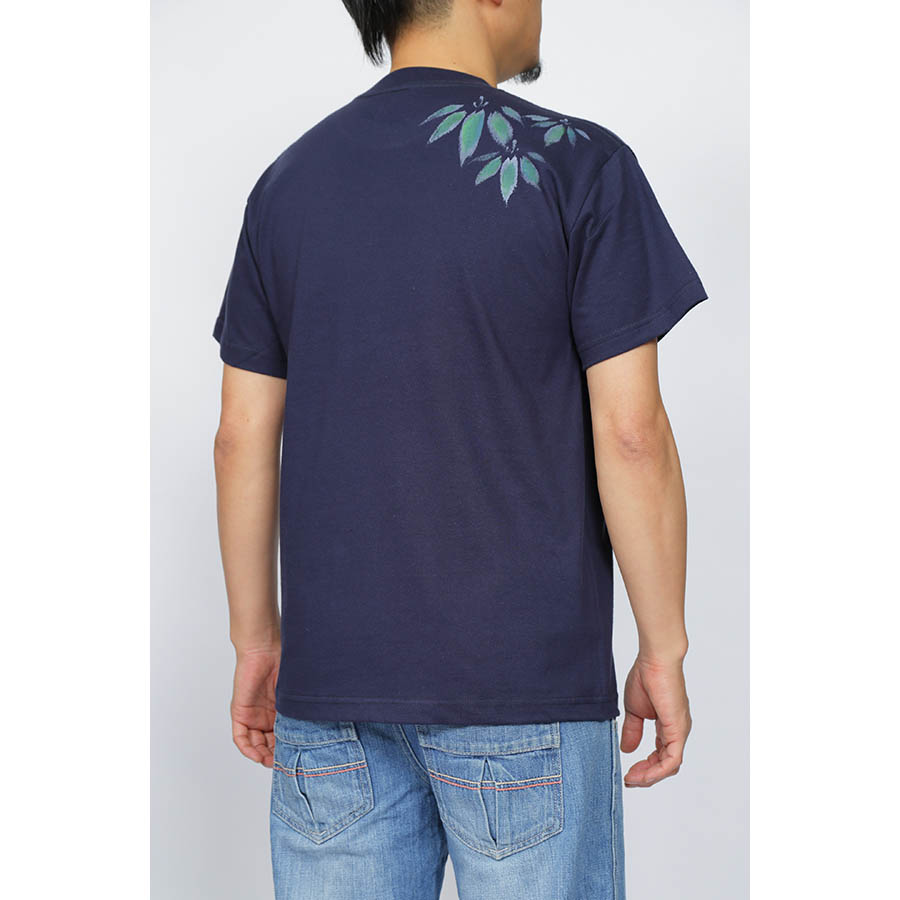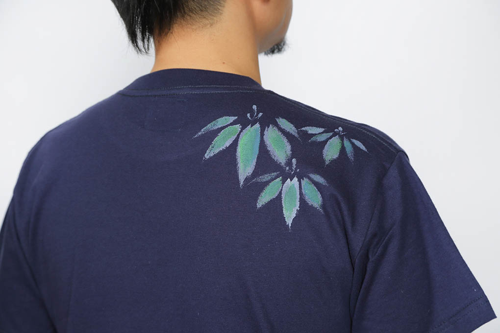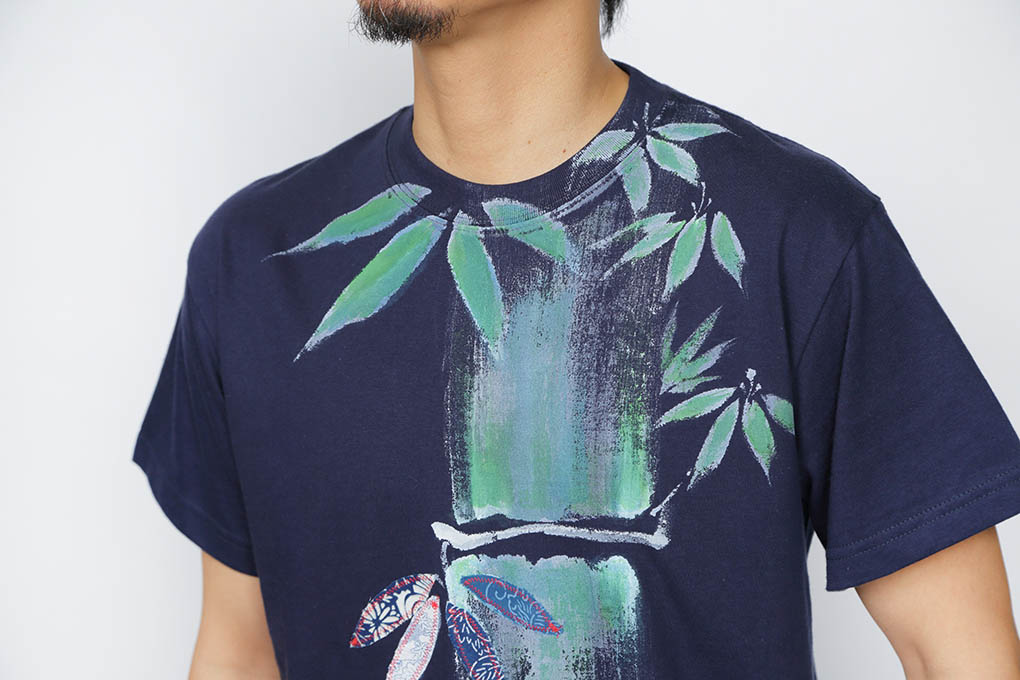 平安時代からの面影を色濃く残す、嵯峨野の竹林は雅で心を和ませます。 その竹林の中、日光をたくさん浴びた太く真っ直ぐな孟宗竹から、可愛らしい生き物が顏を覗かせております。 Tシャツ中央の笹には浴衣生地を使い、リメイクしております。 描かれた竹の様に太く真っ直ぐに進みたいと願います。