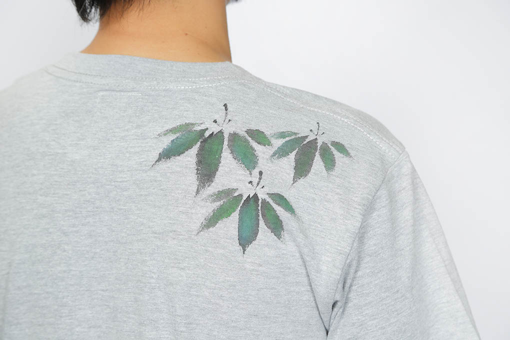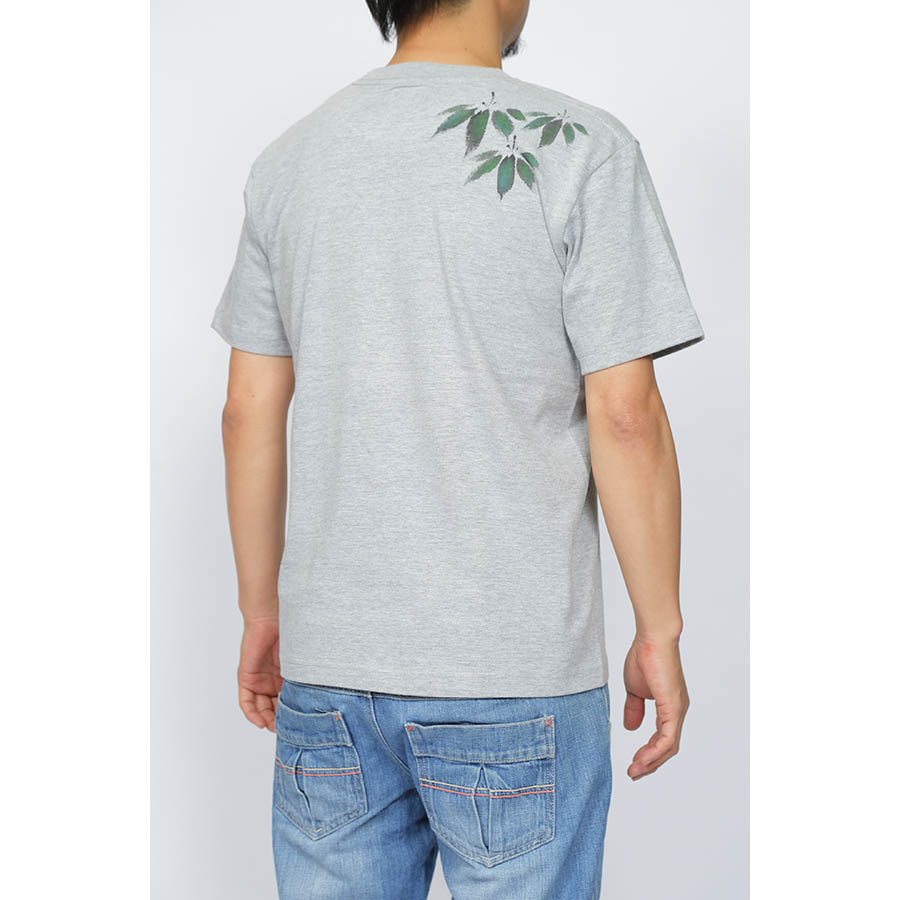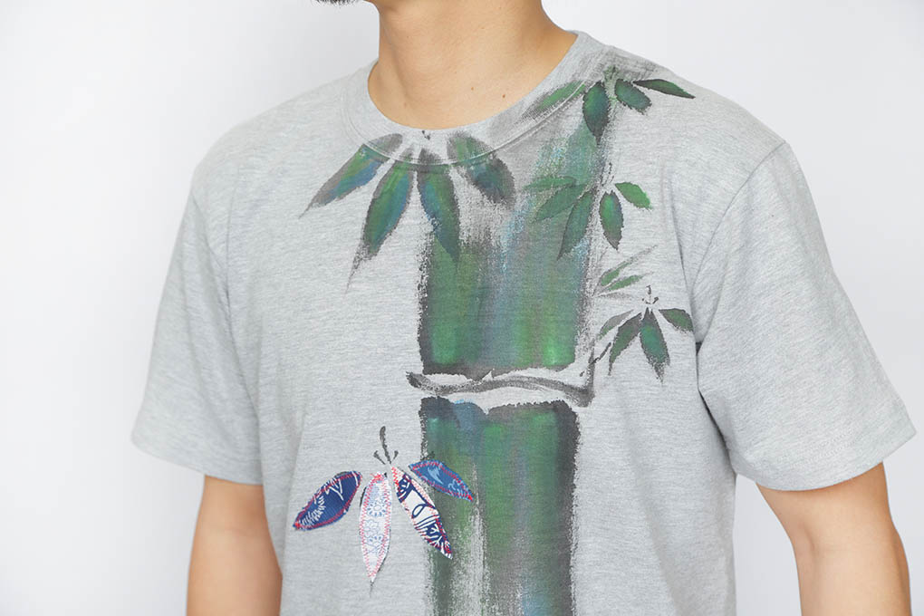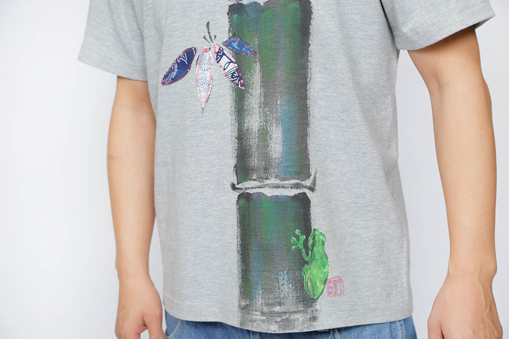 平安時代からの面影を色濃く残す、嵯峨野の竹林は雅で心を和ませます。 その竹林の中、日光をたくさん浴びた太く真っ直ぐな孟宗竹から、可愛らしい生き物が顏を覗かせております。 Tシャツ中央の笹には浴衣生地を使い、リメイクしております。 描かれた竹の様に太く真っ直ぐに進みたいと願います。