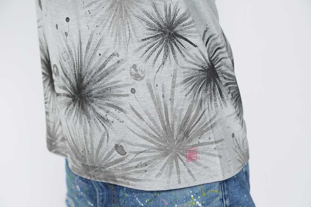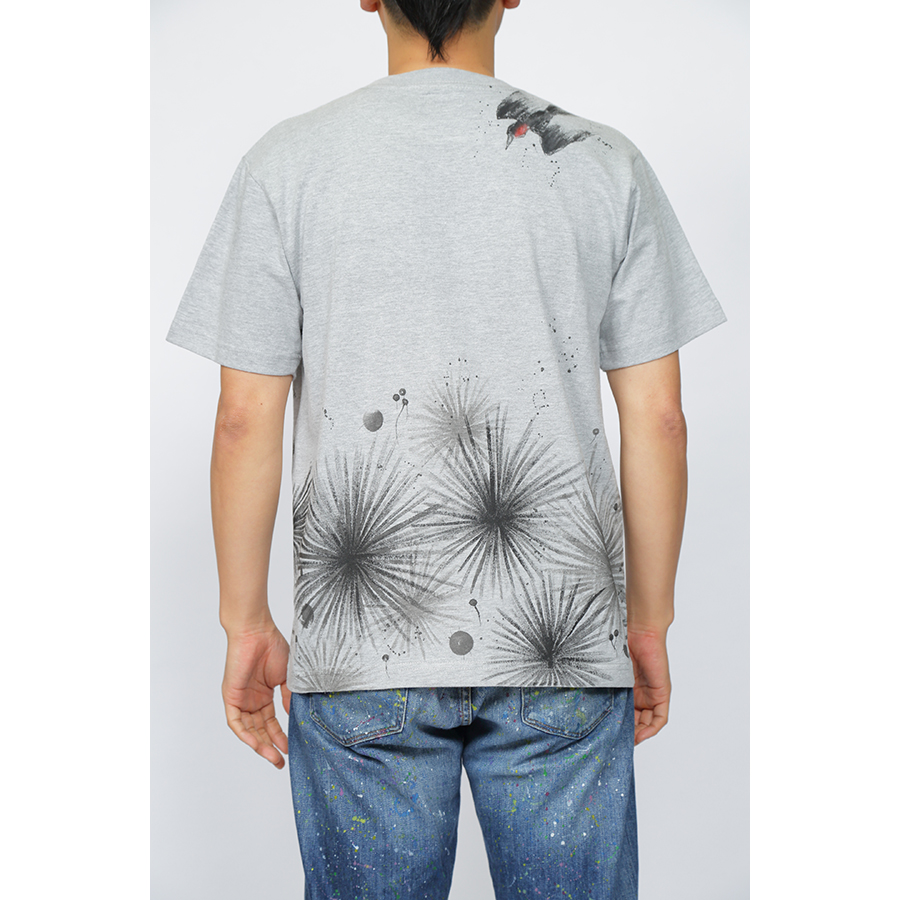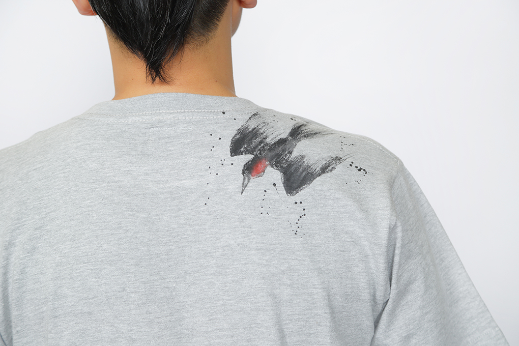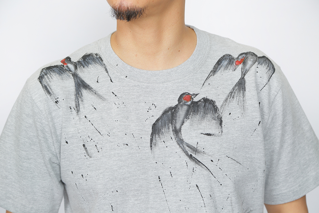 「棕櫚の葉かざす」とは勝利をたたえると言う意味です。闘技会の勝利者には勝利の証に、棕櫚(シュロ)の葉が与えられたりもします。 また、その上を楽しく飛び交う縁起の良い燕達。 ツバメが巣を作る場所というのはヘビやカラスが来ない安全な場所、つまり人の出入りの多い賑やかな場所ということになります。そのことが商売繁盛と結びついて入り口に燕の巣がある所は縁起がいいと言われるように! 縁起物が重なるTシャツを着て、この夏をお迎え下さい!!