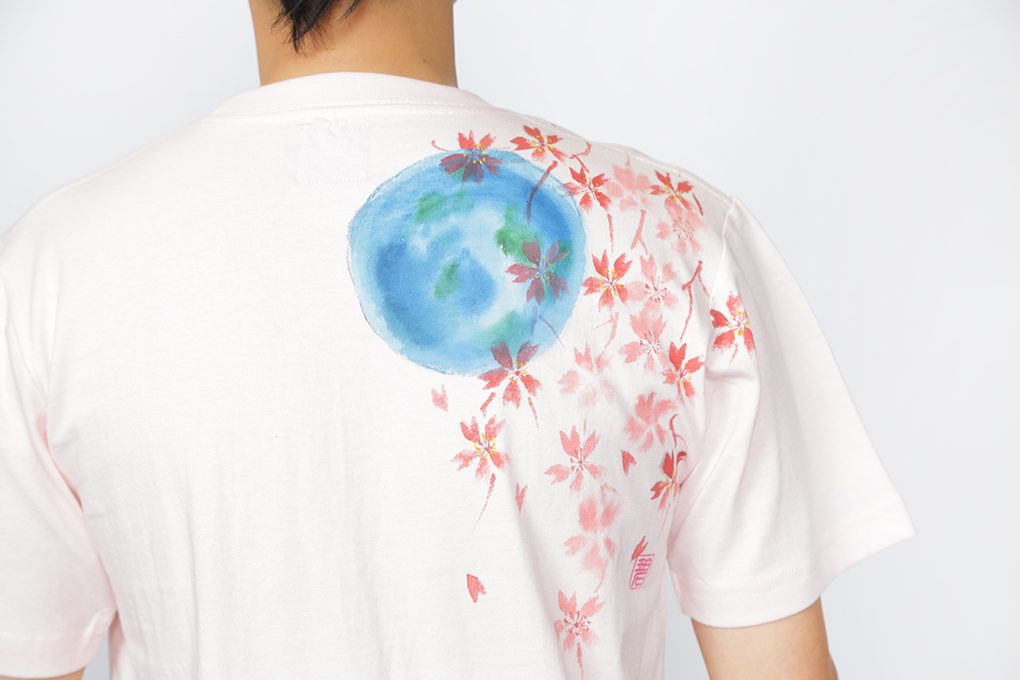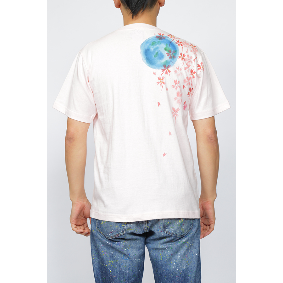 満月の夜、お寺で桜を愛でた西行法師が歌を読み、心和ませた桜。 手描きで何度も何度も色を重ね、一つ一つ絵付けされた桜達は色っぽく艶やかに仕上がりました。 このTシャツを着て、お花見に出掛けて下さい!
