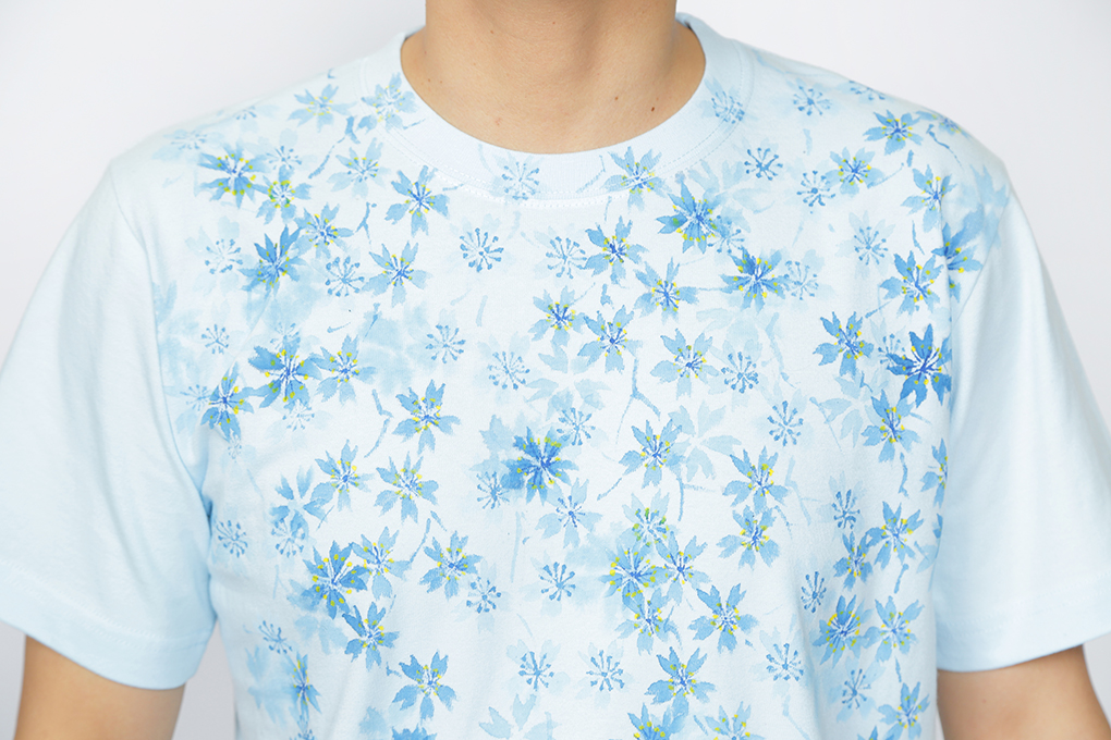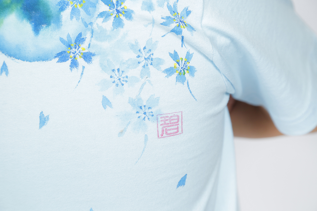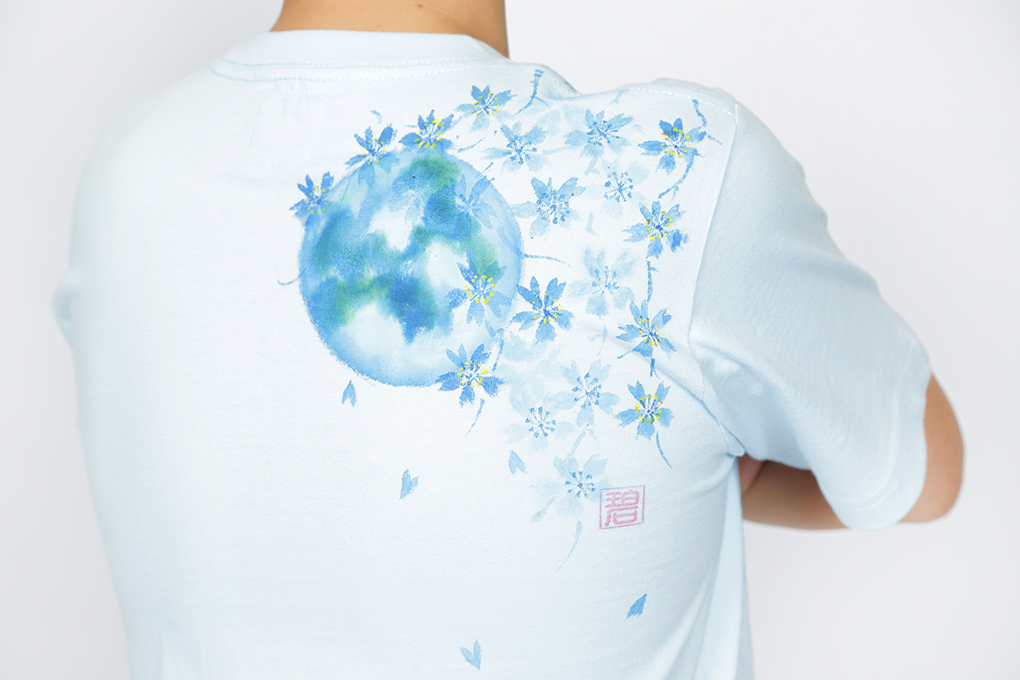 満月の夜、お寺で桜を愛でた西行法師が歌を読み、心和ませた桜。 手描きで何度も何度も色を重ね、一つ一つ絵付けされた桜達は色っぽく艶やかに仕上がりました。 このTシャツを着て、お花見に出掛けて下さい!