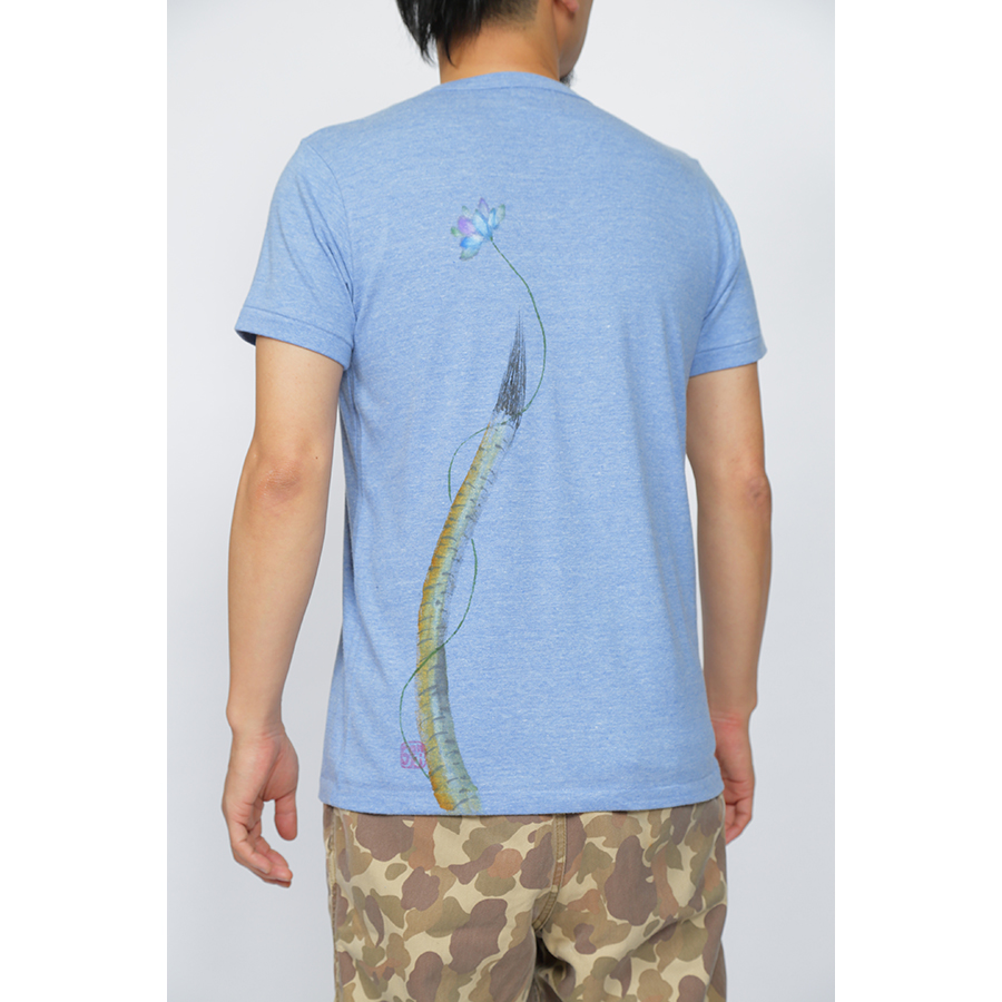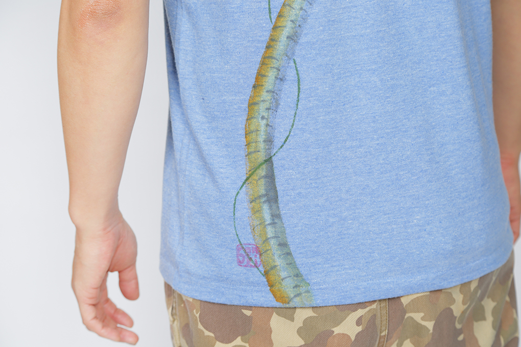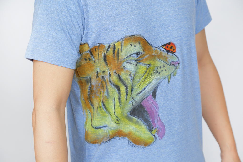 京都動物園の虎はお昼に大きなあくびをします。その無防備な虎の鼻に天道虫が止まりました!まるで何も出来ない虎を知っての行動の様です。午後の穏やかで優しい時間を想像し作りました。 綿とレーヨンが組み合わさった柔らかくてとても着心地の良いTシャツです。