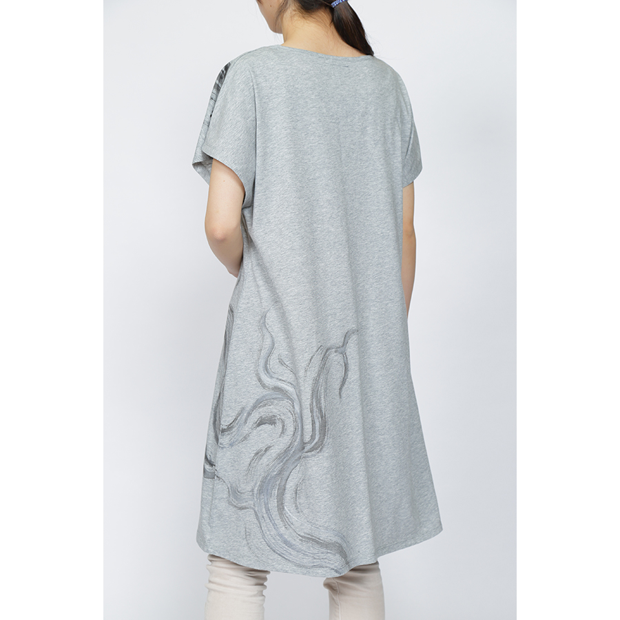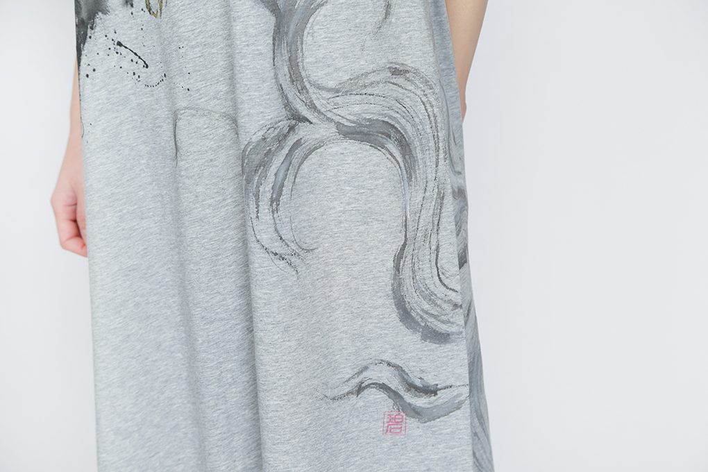 強風に立ち向かい風をよけ、獲物を狙う姿を描きました。 鷹の視野は広く、人間の約8倍の視力を持ち、1,500mの高さからも獲物の姿を見つける事が出来ます。 その勇ましい鷹の姿を墨濃淡で表現し、ポイントのくちばしと爪に金色を絵付けしました。 そんな、男性が好む鷹の姿や色使いを、女性の方に粋に着こなして頂きたいワンピースです。