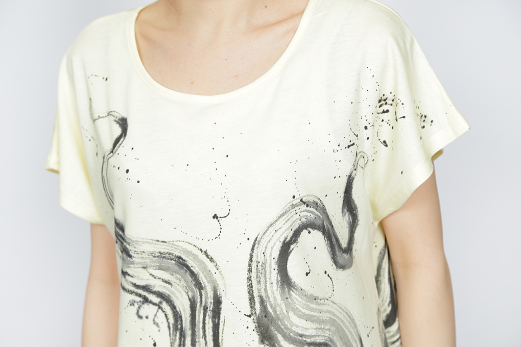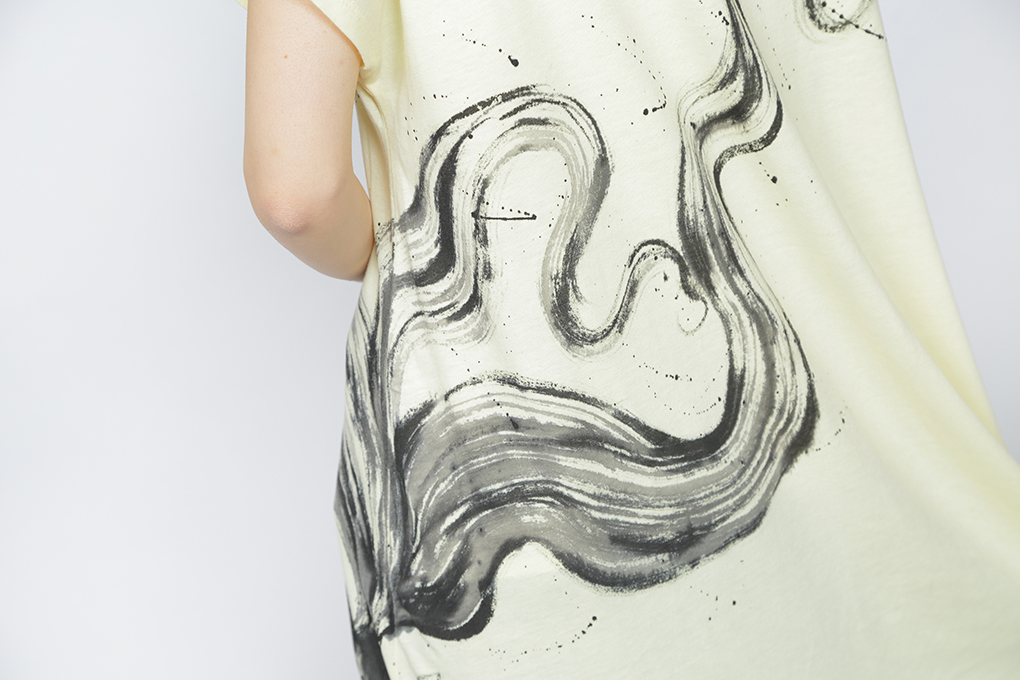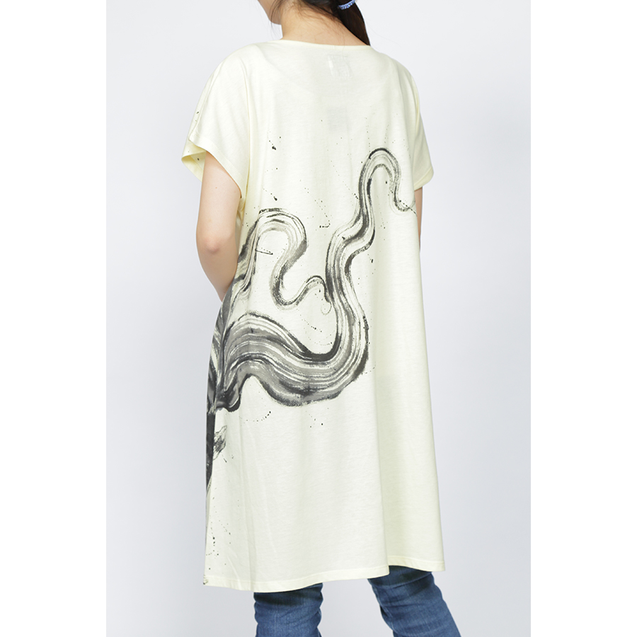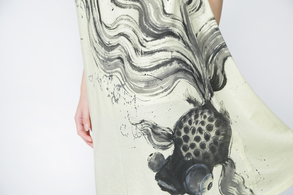 小さな出目金をワンピースいっぱいに大きく表現し、エサを求め、動きまわり人間を睨みつけた表情は生き残って行く厳しさを感じさせてくれます。 愛らしい動きで、私達を和ませてくれる小さな出目金とは逆の表現をしました。 チュニック丈のTシャツ素材は楽に便利に使いこなせる一品です。