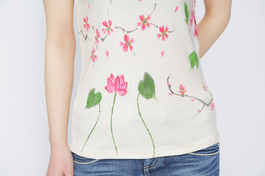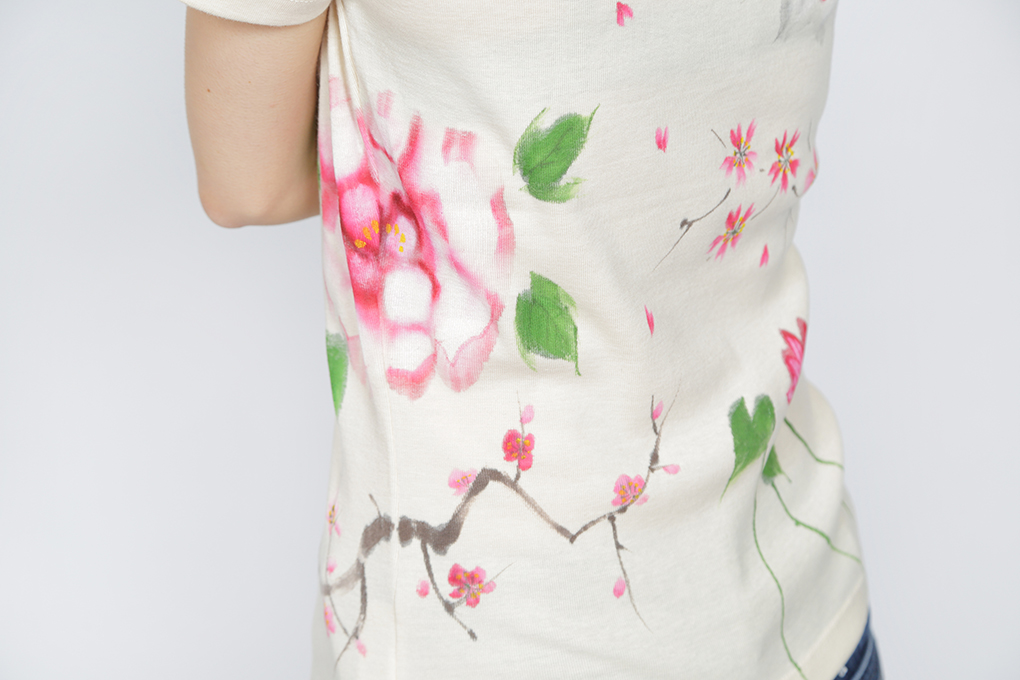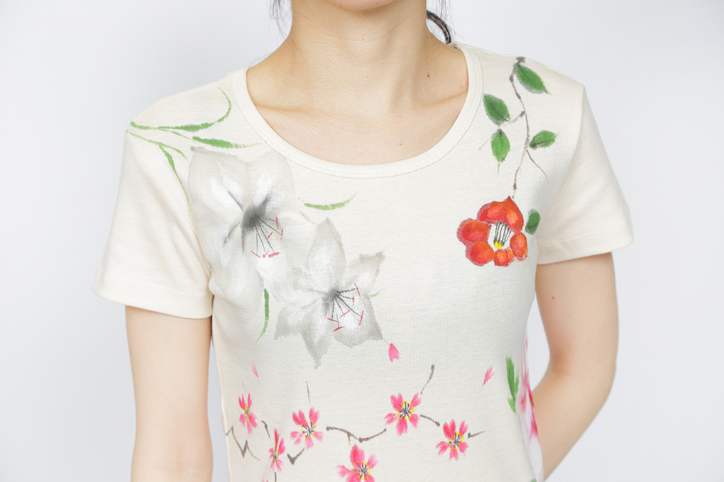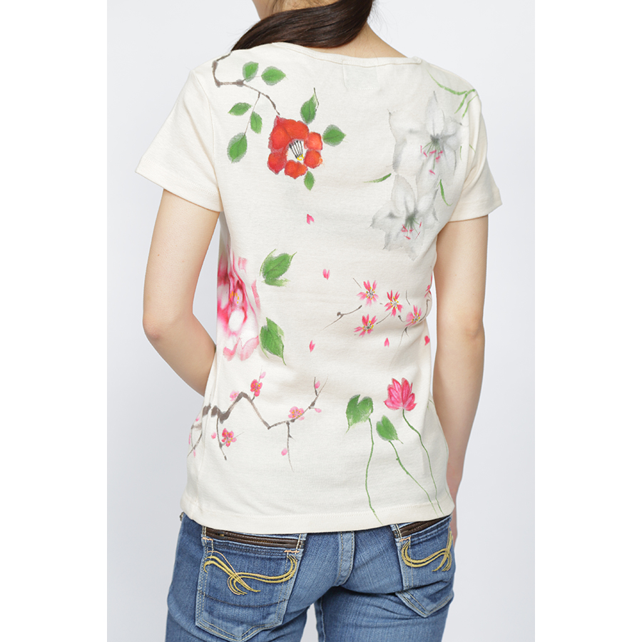 四季の花を一枚のTシャツの中に盛り込みました。 年中楽しんで頂けるTシャツは華やかで豪華な一枚に仕上がり、身に付けて頂ける方はもちろん、見る人の心も和やかにする豪華な一品です。伸縮性のあるフライス素材でシルエットが綺麗なTシャツです。一枚で着ても羽織物の下からインナーとして覗かせても存在感のある一品です。