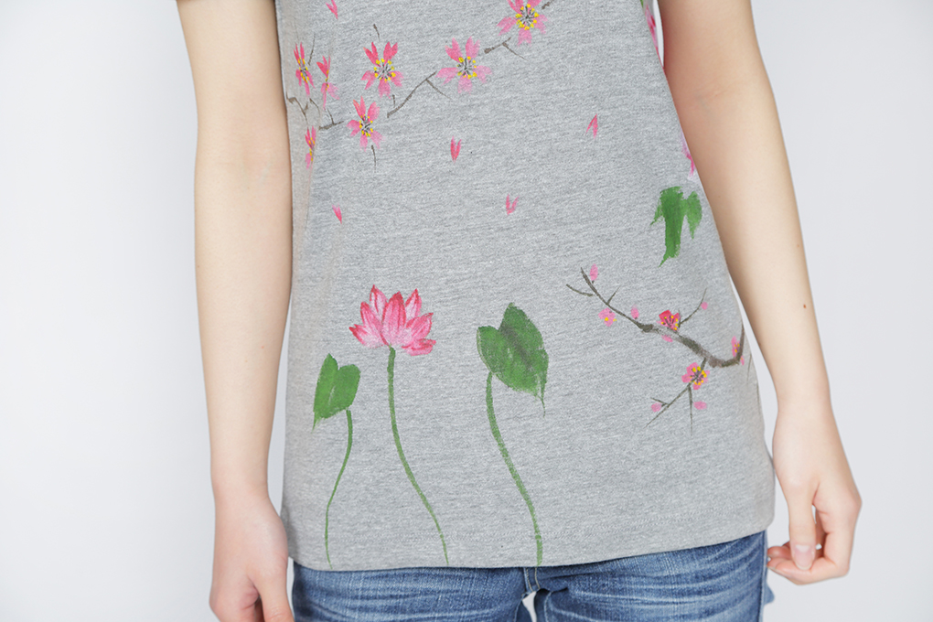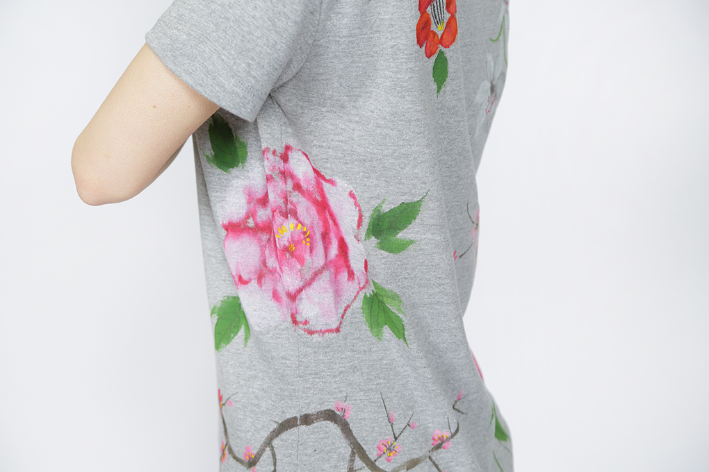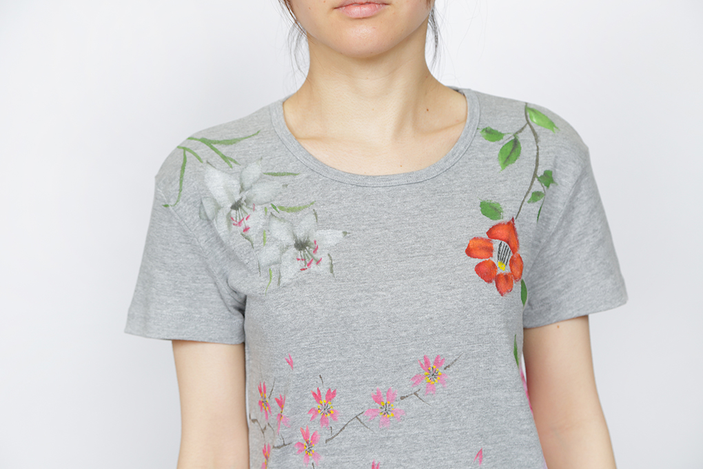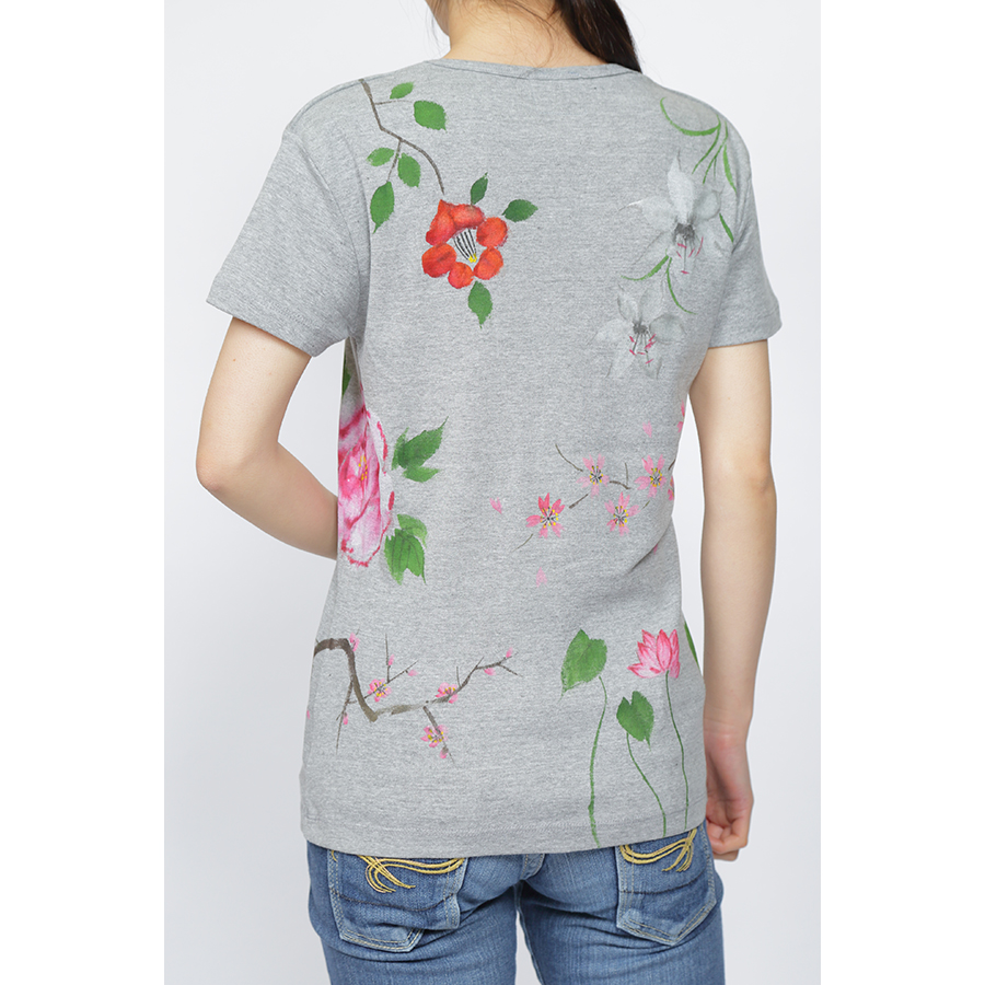 四季の花を一枚のTシャツの中に盛り込みました。 年中楽しんで頂けるTシャツは華やかで豪華な一枚に仕上がり、身に付けて頂ける方はもちろん、見る人の心も和やかにする豪華な一品です。伸縮性のあるフライス素材でシルエットが綺麗なTシャツです。一枚で着ても羽織物の下からインナーとして覗かせても存在感のある一品です。