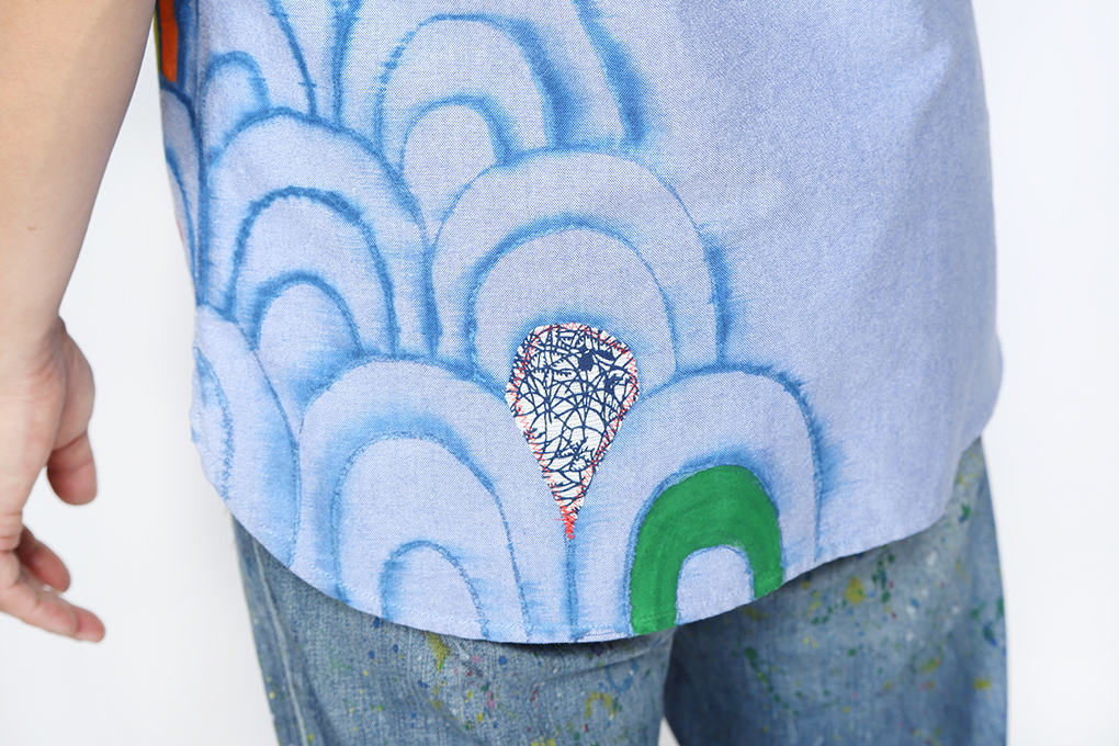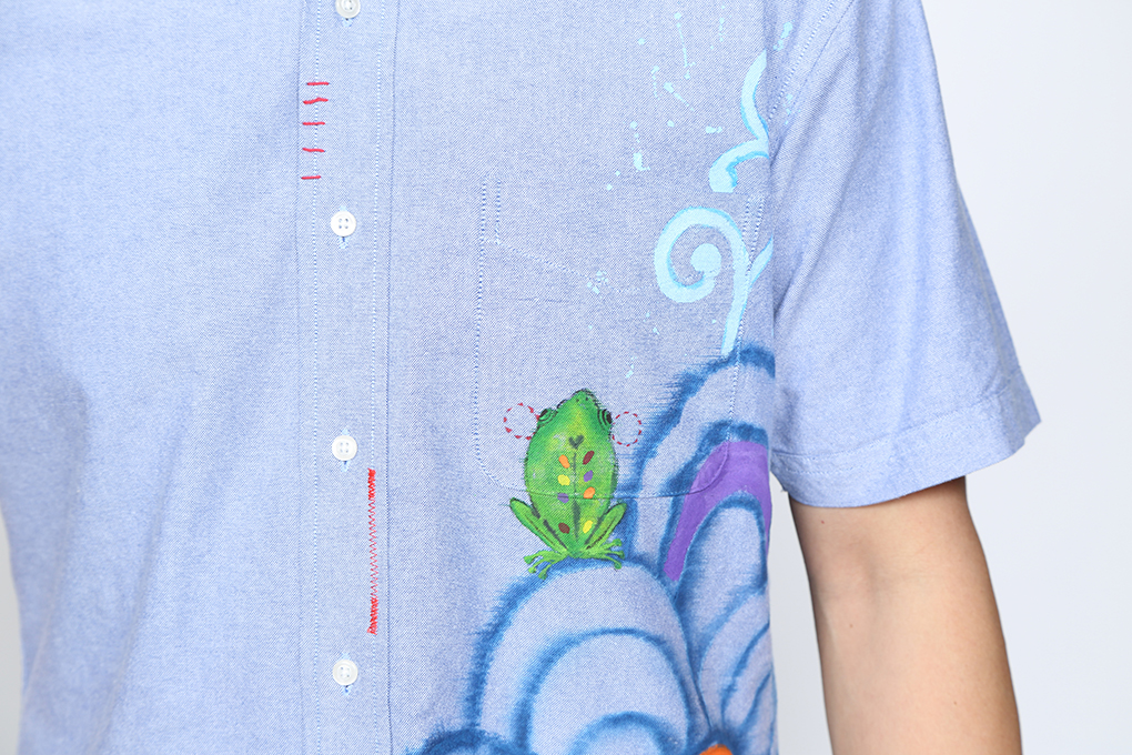 青海波と蛙古くから伝わるこの波の文様は広い海の恩恵を意味する縁起物の柄。 永遠に続く幸せを願う青海波の柄に、「福が返る(蛙)」と因んで可愛い蛙も波乗りしています。浴衣生地や着物生地をリメイクしたり、赤いステッチを入れたりして遊び心を添えています。 ※一つ一つ手作りの為、リメイク生地は多少異なりますのでご了承下さい。