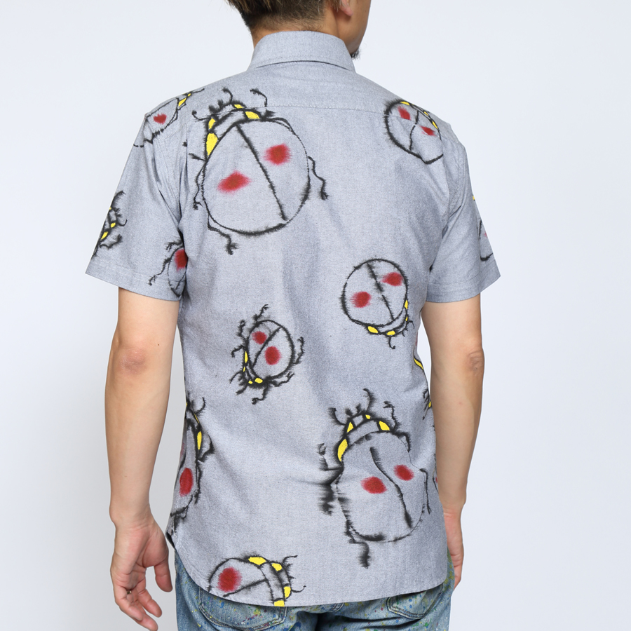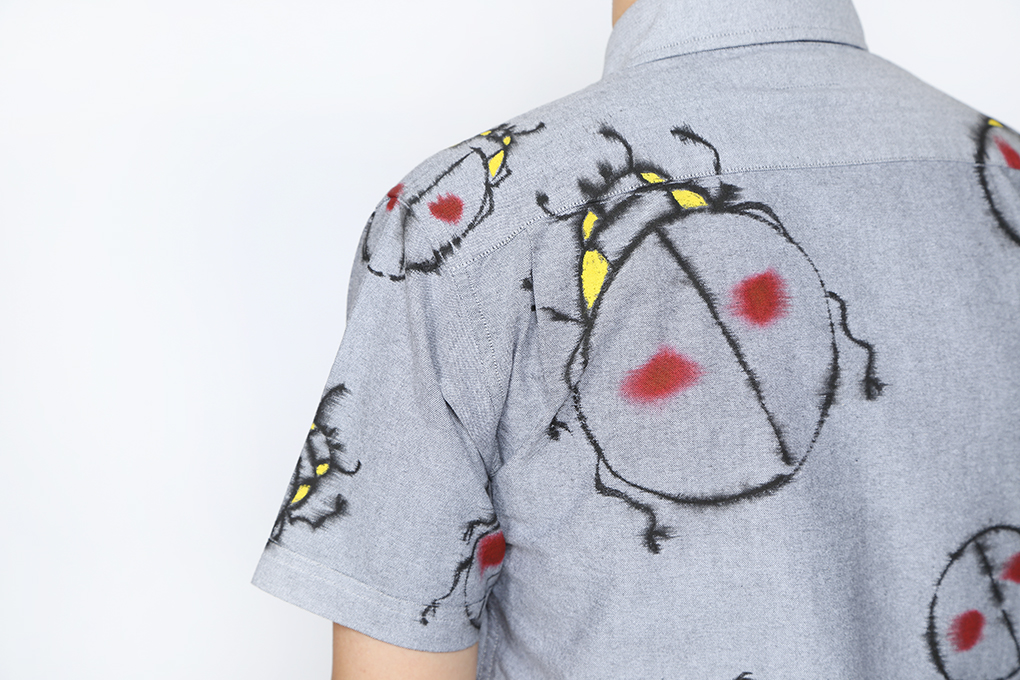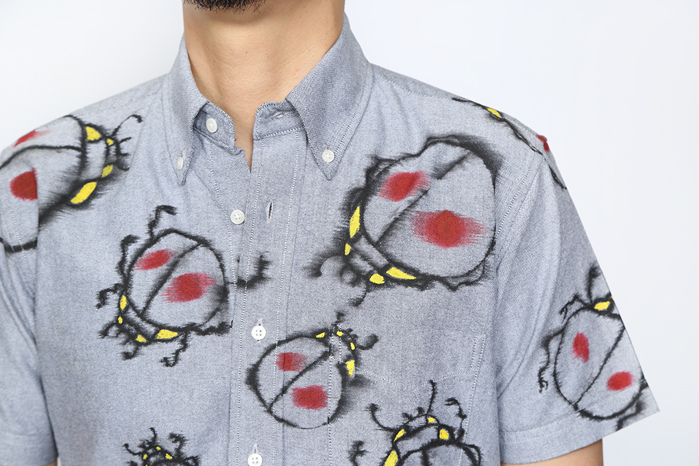 アブラムシを駆除してくれる二つ星天道虫が沢山飛んでいます。 墨濃淡の線描きで表現した天道虫がぼやけて滲んでいるのが抽象的で面白く総柄になっていても楽しい一枚です。