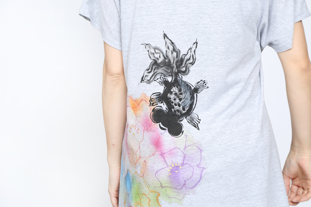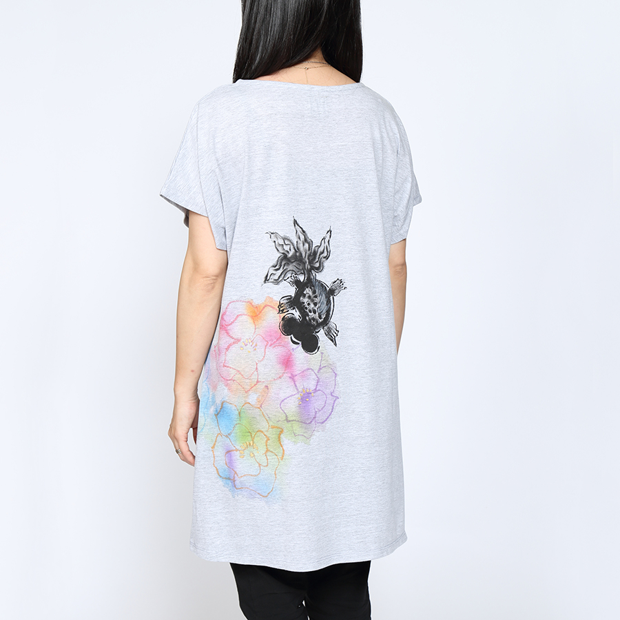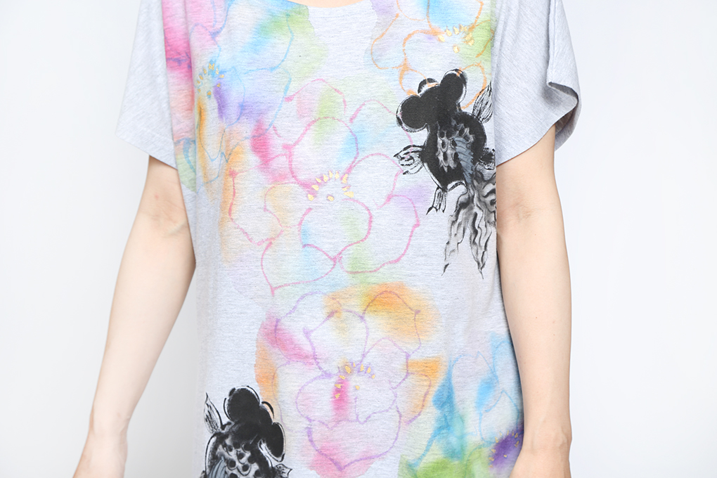 黒い金魚は「厄除け」「魔除け」と言われ赤い金魚と同様、縁起物。 作家独特の偶然の滲みで表現したカラフルなお花の中をシックな黒出目金が楽しそうに泳いでいます。 涼し気で華やかです。