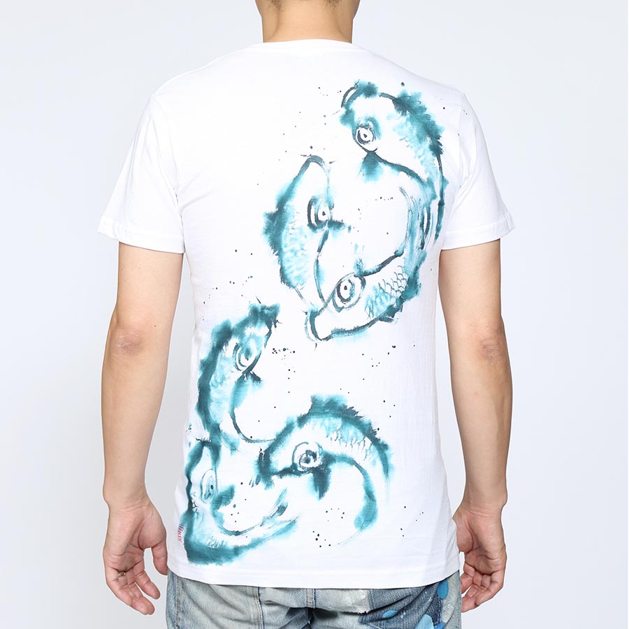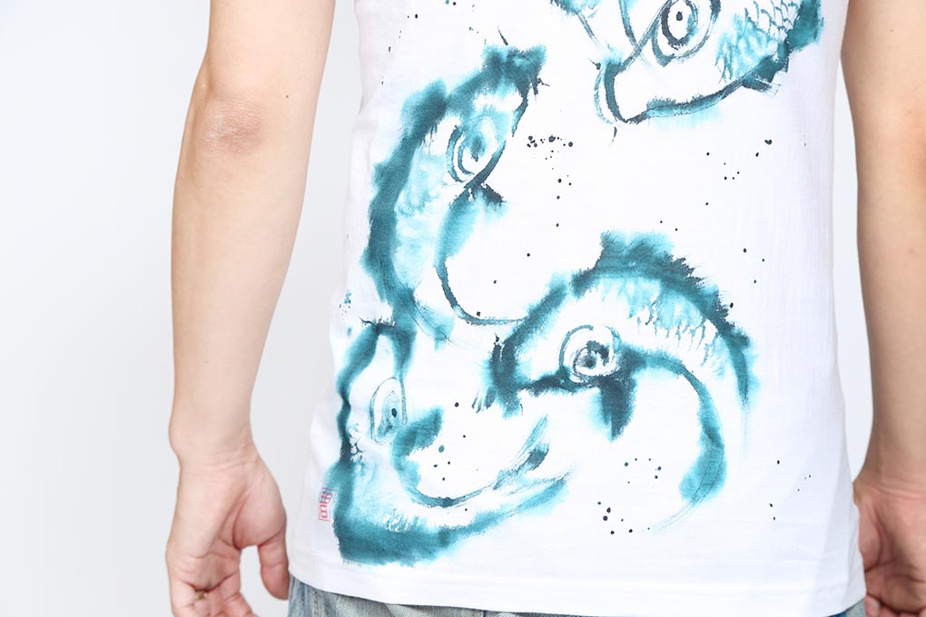 鯉は神様の下僕で成功を神様から運んでくるという伝説がある縁起物です。 その鯉を味のある筆のタッチで沢山泳がせました。鯉がダンスをしている様に勢いのある一枚に仕上がりました。
