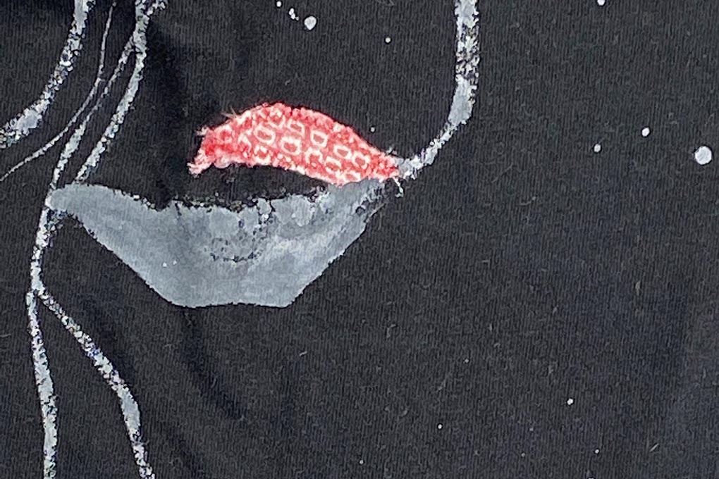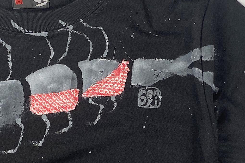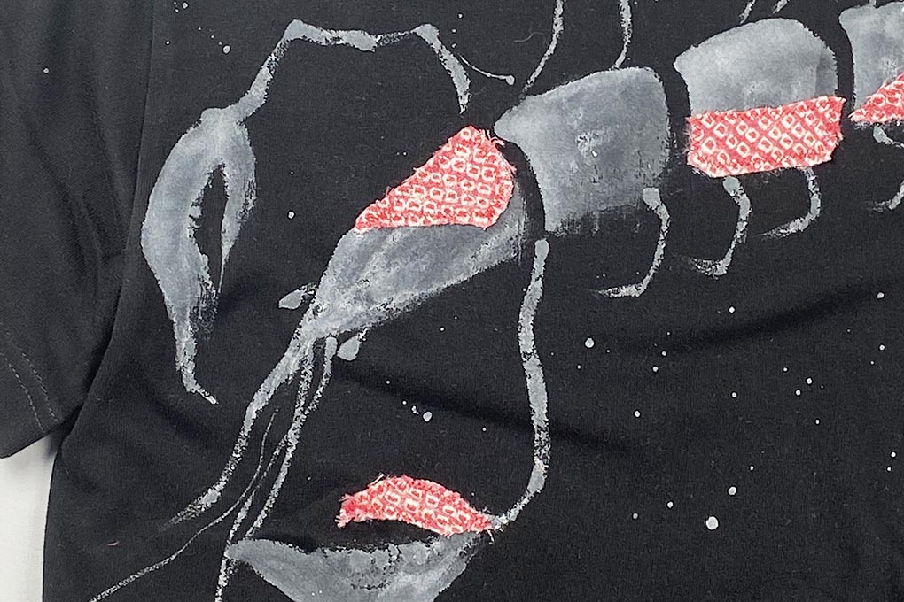 身体よりも長い手足。不思議なフォルムで手長海老を表現しました。 高度な職人技である京鹿の子絞り。 その生地を体に付けて面白いリメイクをしました。 独特の立体感や色合い、そして、繊細なにじみと作家独特の大胆な筆使いをお楽しみ下さい