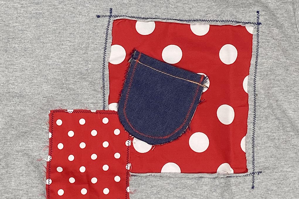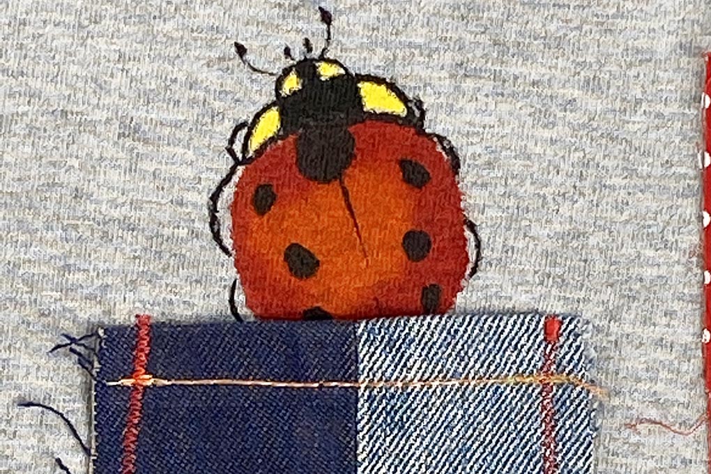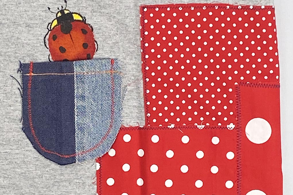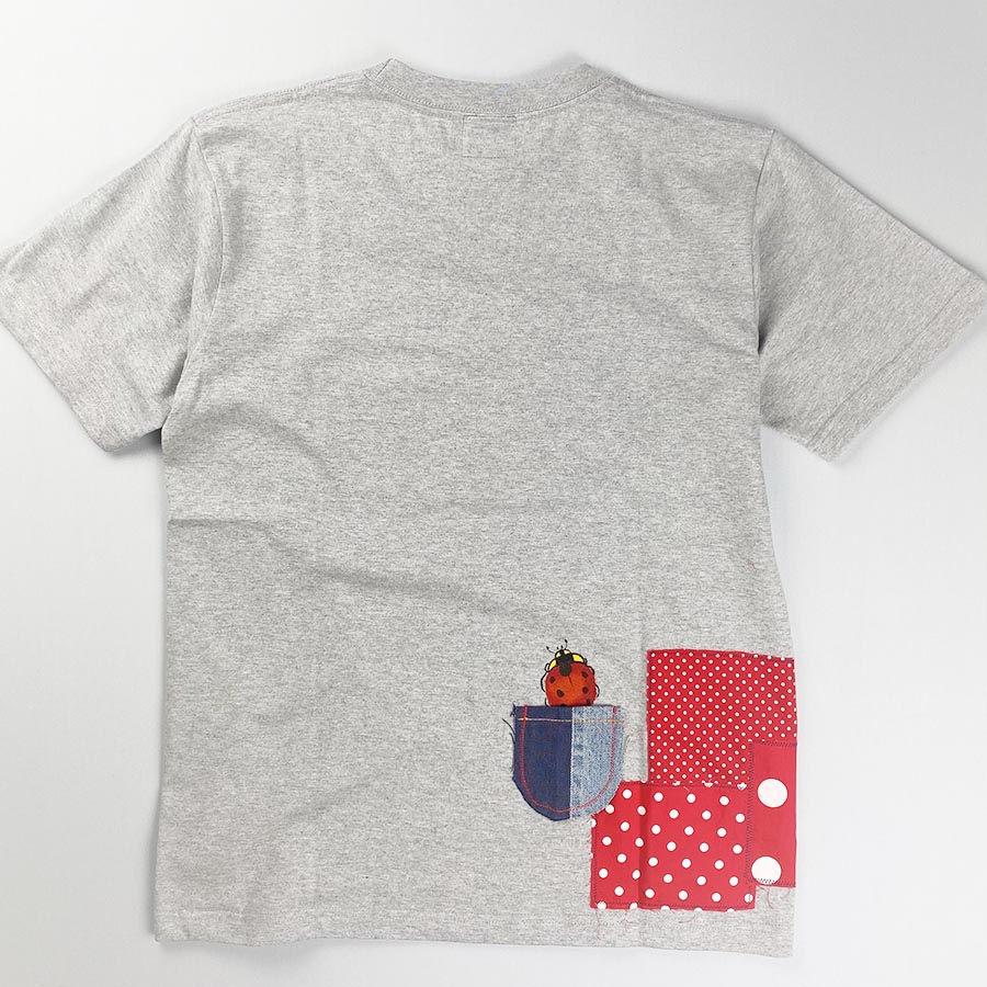 可愛い3種の水玉生地をパッチワークしたポップなTシャツです。 デニムの小さなポケットとちょこんと可愛いてんとう虫がアクセント! お洒落な大人の方も楽しめるTシャツです。