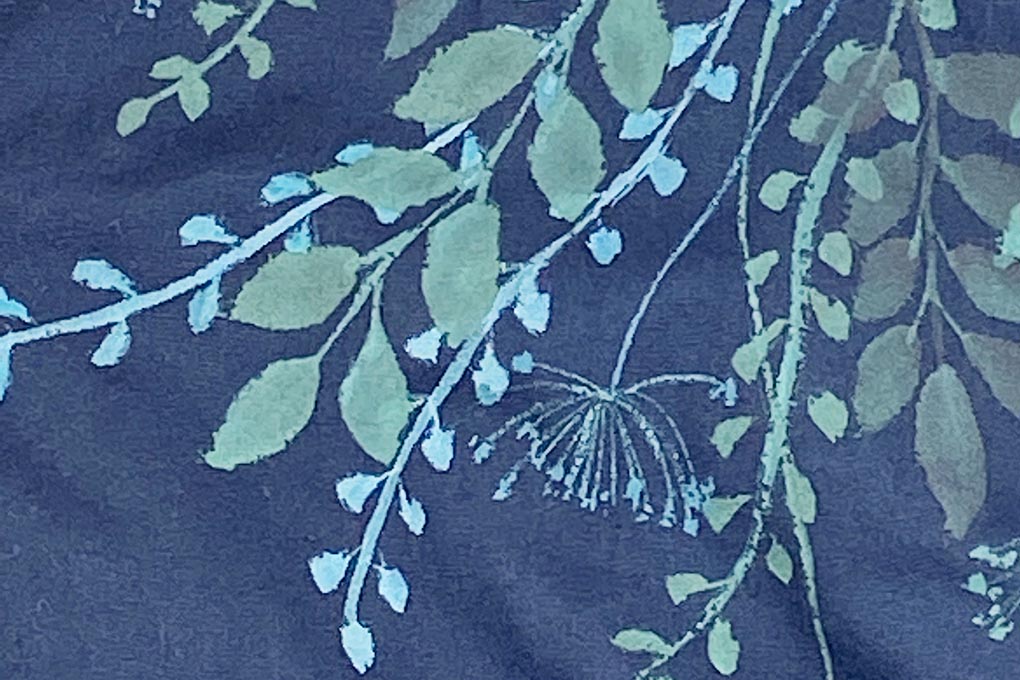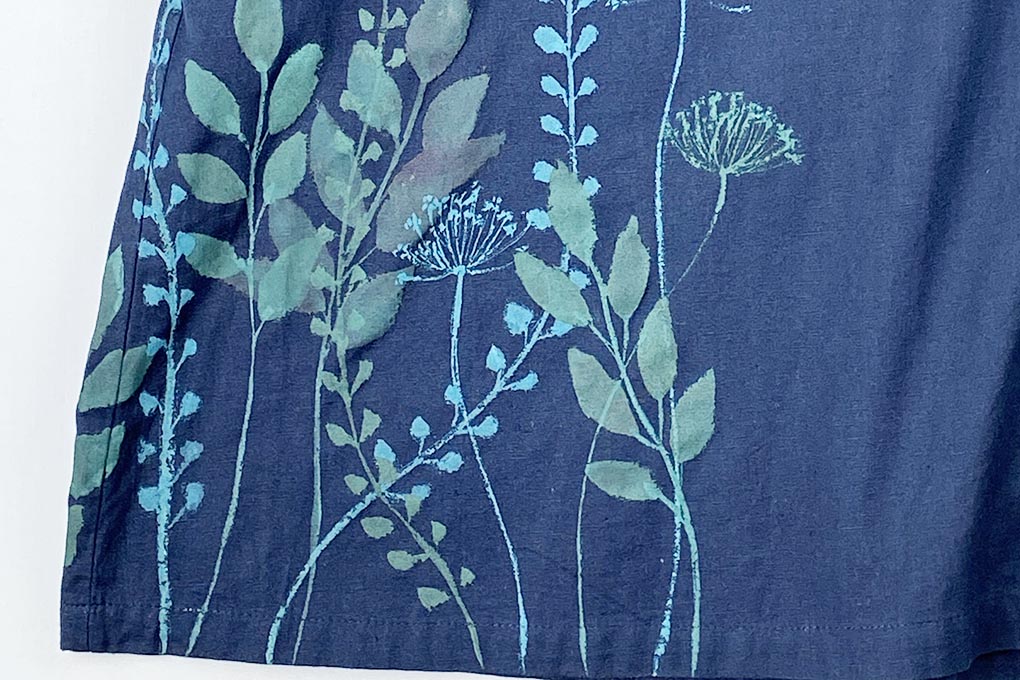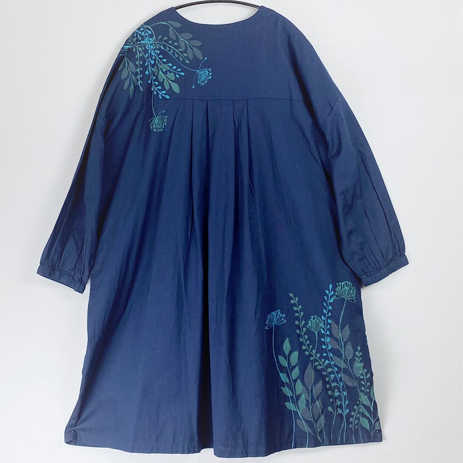肩から、裾から葉っぱが生き生きと延びています。 明るい色目と濃色の色目を重なり合わせて蔦や蔓を表現しました。 落ち着いたシックな柄が粋です。 ワンピースでスッポリ着て頂いても、前釦を開けてコートジャケットの様に羽織っても、着まわしの効く一枚です。