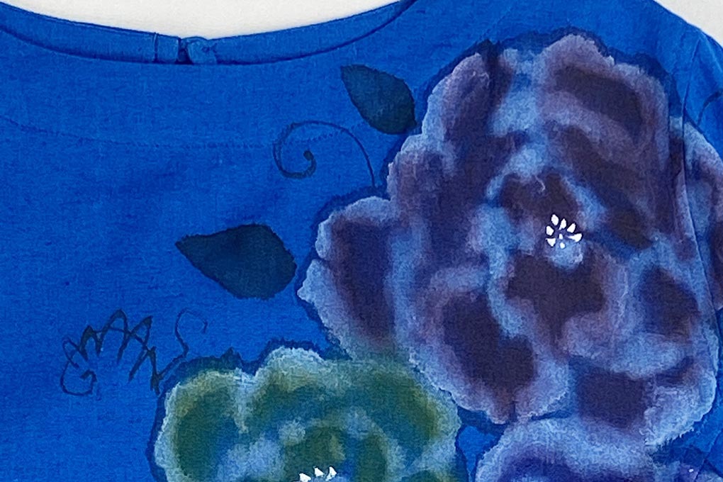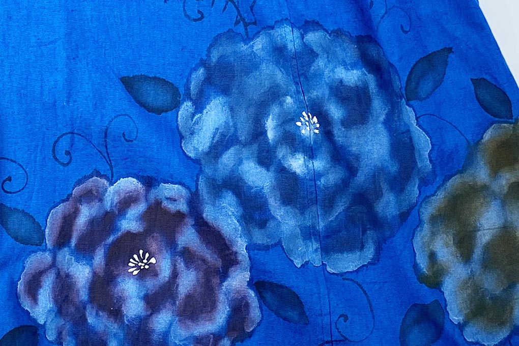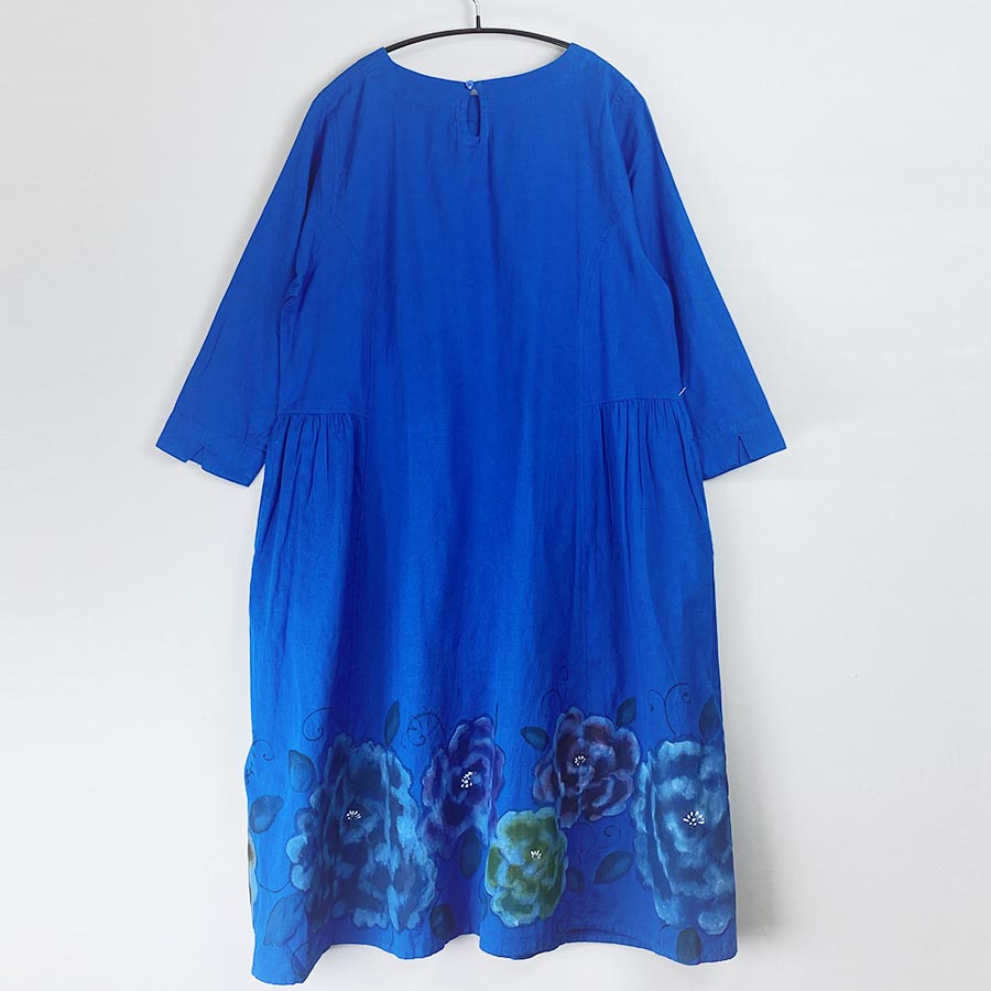とても華やかなワンピース。碧の定番である花、カラフルな色目の艶やかな花を裾にぐるりと描きました。 腰回りに少しギャザーがあることで可愛いらしいシルエットです。