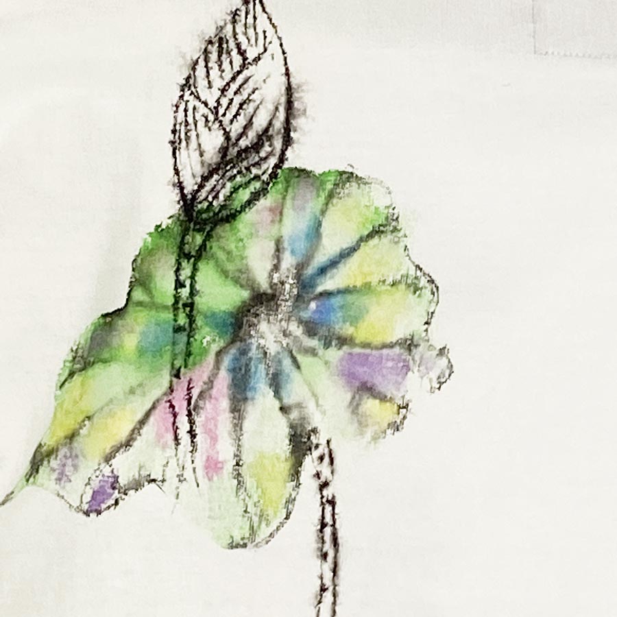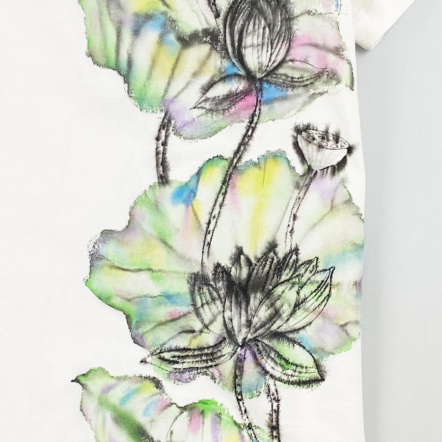 泥の中から茎を伸ばして花を咲かせる蓮。 泥水を吸い上げながらも美しい花を咲かせるその姿は神秘的で神聖です。花言葉は「清らかな心」 そんな蓮を七色の滲みで表現した美しい一枚です。