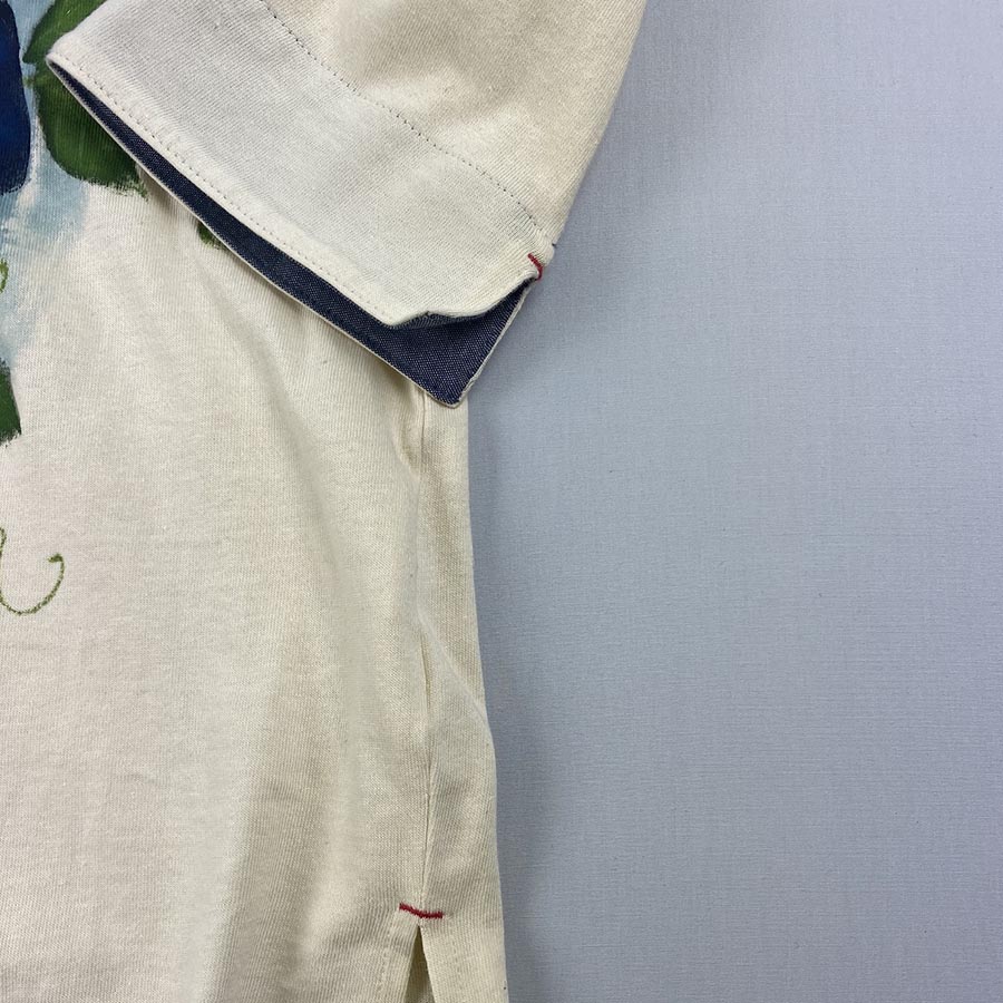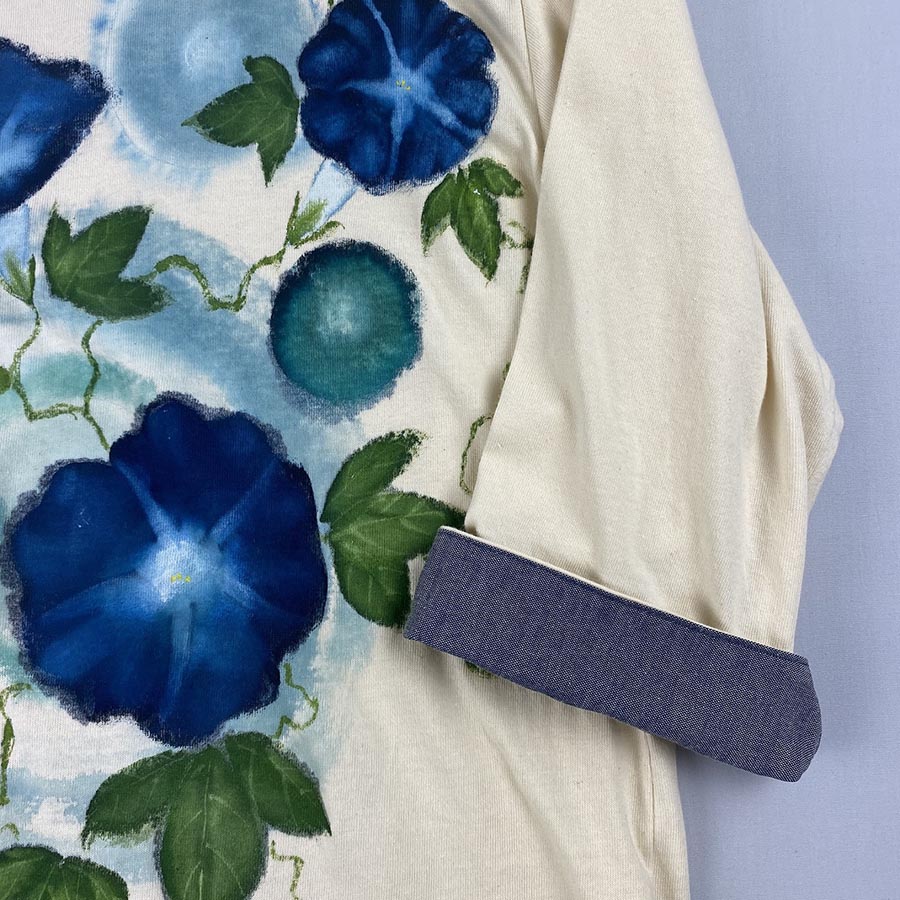 コットン天竺素材がふわふわしていて心地良い七分袖丈のボートネックカットソーです。 袖口は折り返すとシャンブレー素材が可愛らしくロールアップしてもそのまま着ても素敵な一枚。 裾にはスリットが入っていて、赤い糸がワンポイント。 朝に花をさかせて昼にはしぼんでしまう儚い花、朝顔。そんな美しく瑞々しく咲いている朝顔を前身に大胆に描きました。
