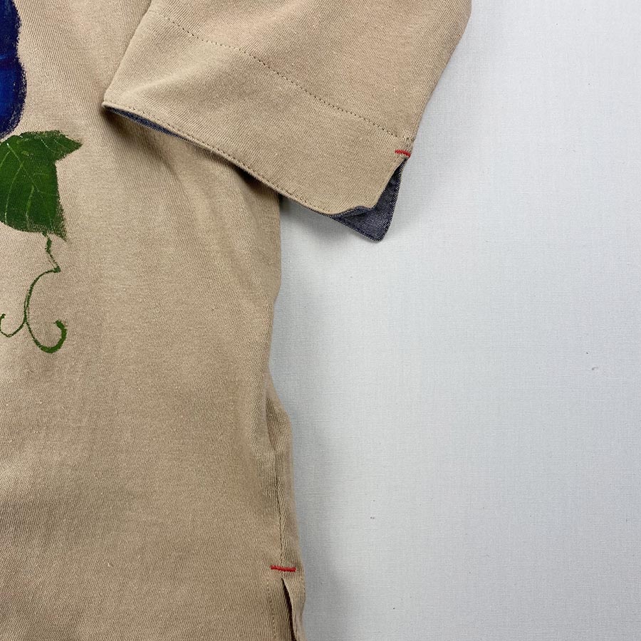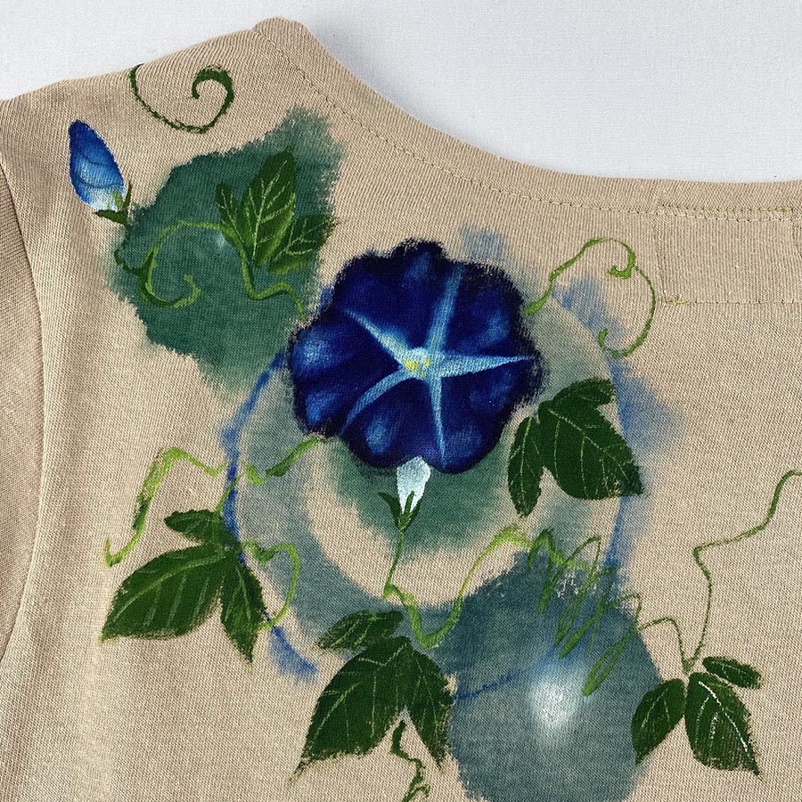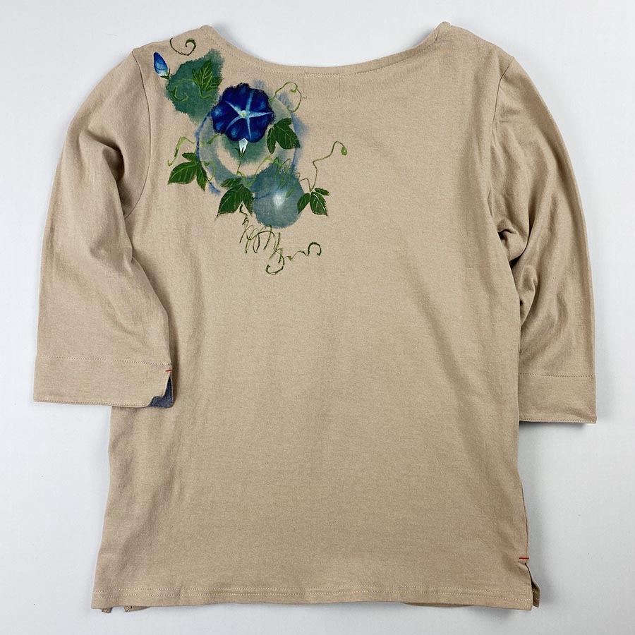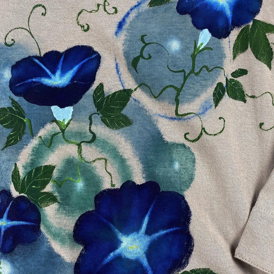 コットン天竺素材がふわふわしていて心地良い七分袖丈のボートネックカットソーです。 袖口は折り返すとシャンブレー素材が可愛らしくロールアップしてもそのまま着ても素敵な一枚。 裾にはスリットが入っていて、赤い糸がワンポイント。 朝に花をさかせて昼にはしぼんでしまう儚い花、朝顔。そんな美しく瑞々しく咲いている朝顔を前身に大胆に描きました。