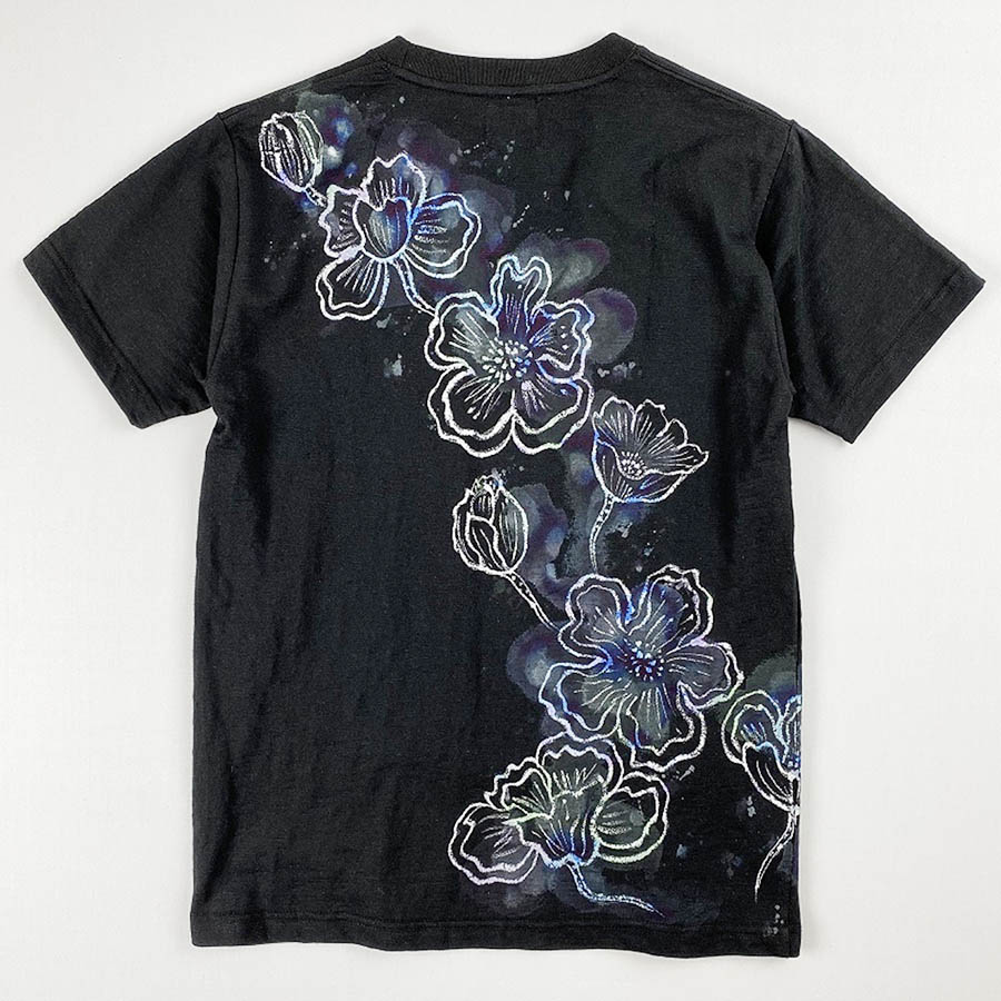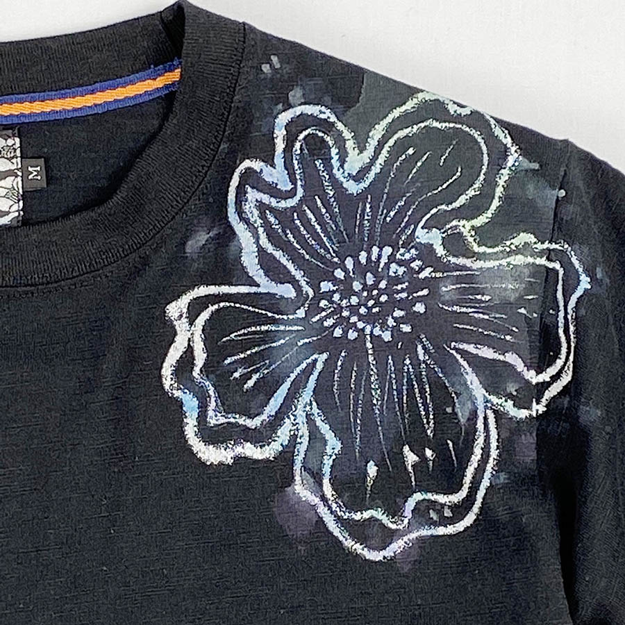 ふんわり柔らかな着心地の良いスラブTシャツ。 表面に凸凹があり味のある素材。 そのTシャツに抽象的な芥子の花を咲かせました。 滲み暈しと筒描き風の線上げの組み合わせで表現しています。 はかなくも幻想的な芥子の花です。