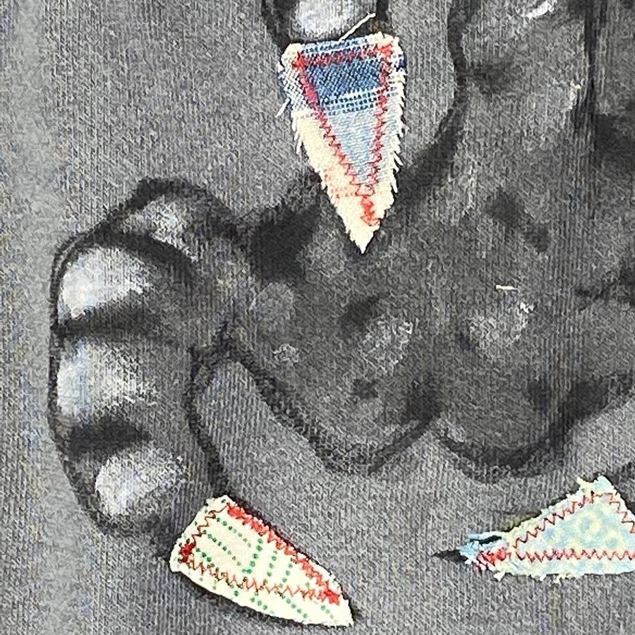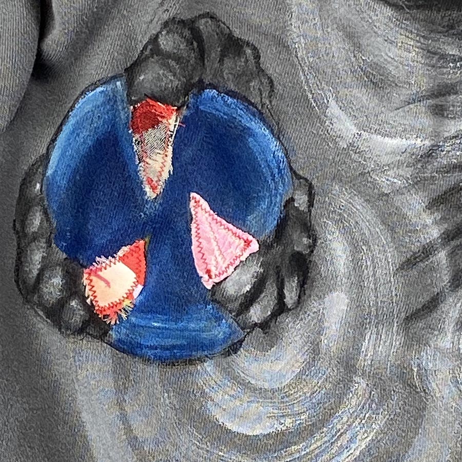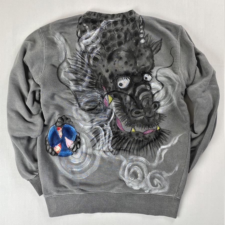 そこにとても大胆に龍を背中に描いています。蒼くて美しい宝珠を天から持ってきた龍の爪には布地をリメイクしていて前身も後身も味があります。濃いめのグレーに墨濃淡で描いているので大胆な構図でもシックに楽しいんで頂けると思います。