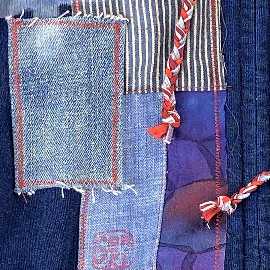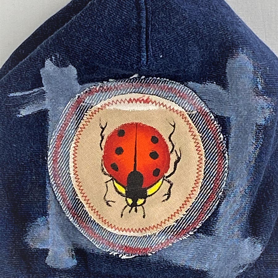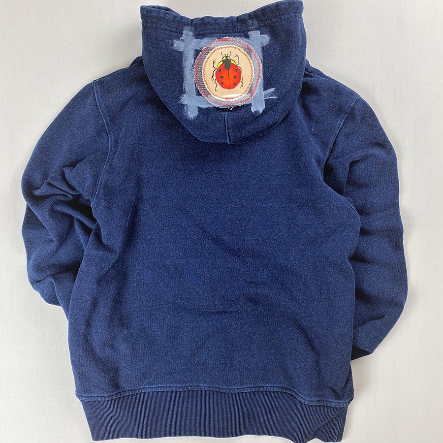 井戸の上部の縁を木で井の字の形に組んだ物を井桁と言いますが、紋所や絣(かすり)の織柄などでも有名ですね。その紋様をパーカーに沢山取り込みました。四角で布地をリメイクしたりフード部分にいるてんとう虫も、まるで井戸の中に居る様。昔の文様とポップなリメイクとの融合が面白可笑しく楽しい一枚です。